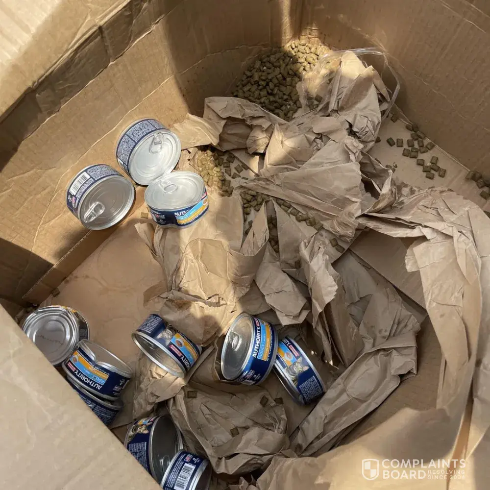 Cat treats damaged and scattered all over the box, several cans were bent and broken open spilled wet food in the box.