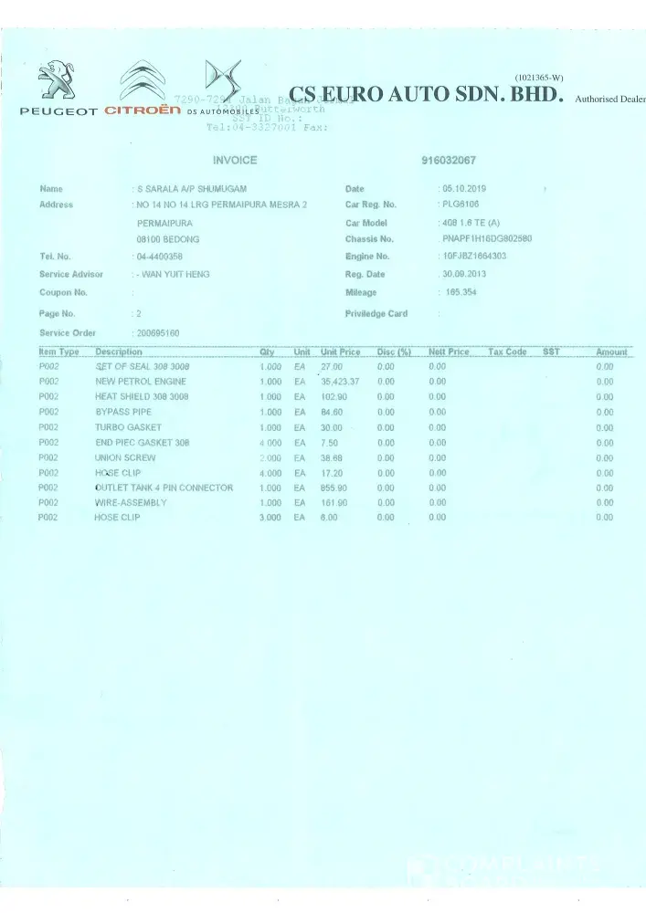 Thanks for your extended warranty for PLG6106 (Peugeot 408 - 1.6 Turbo) Malaysia registration number. After a lot of hassle for last few years (All the while the car being serviced at CS Euro Auto Sdn. Bhd. Taman Bayu, Butterworth, Malaysia.Tel 604- 3327001) the new engine and other parts being fixed and the car being hand over to me on 14 October 2019. After i just drive not even 10 kilometers (with the happiness of new engine and all problems being solved) the "engine faulty repair needed" error pop . The car is under power and the rpm is very high. (All the while same problem being incurred few times and got lodge a complain.) I drive back the car to the center again. As per service personnel the car not enough fuel after fill up should be "ok". After refill the petrol, the problem still there. Than the service personal try to do something and error being resolved. They said the problem solved. After i drive again about 30 kilometers on the way home, the same error pop up again and my car went under power again. Just imagine my trust again the car and the service personal. I call up again and they said i need to drive in again to recheck. I really do not understand what kind of services being provided by the above service center either its a car problem or the service personal is not trained enough. I told them to give me the permanent solution and until till to date i did not get any further feedback from them.