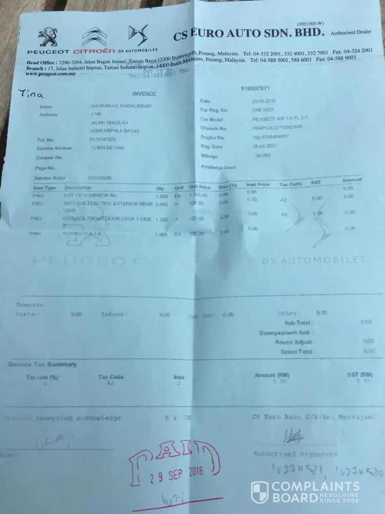 WE have escalated the complaint to Peugeot SA with NO response.