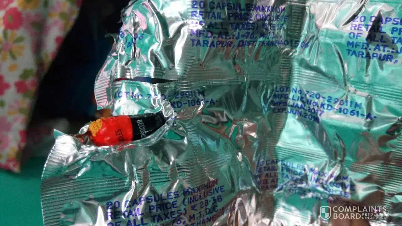 I purchased one strip of b- complex capsules strip in that i found two capsules are sticked to foil in burned condition which is very dangerous, as a big brand i never accept this type of packing.I will just want to complaint to drug department of india.the images are attached for your reference and proof is with me.