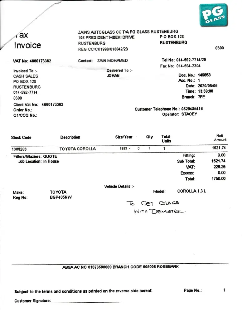 I contact on the 3/5/2020 PG glass Rustenburg (+[protected]) and ask for a rear window with demister for my Corolla after the Gardner damage it with a bush-cutter