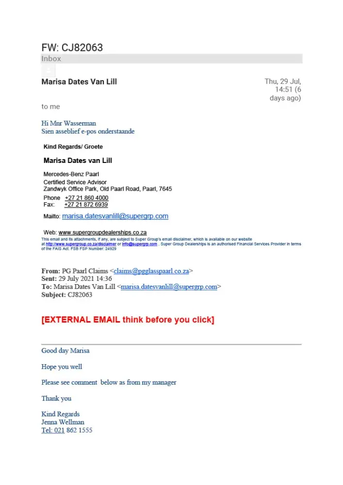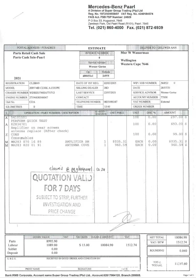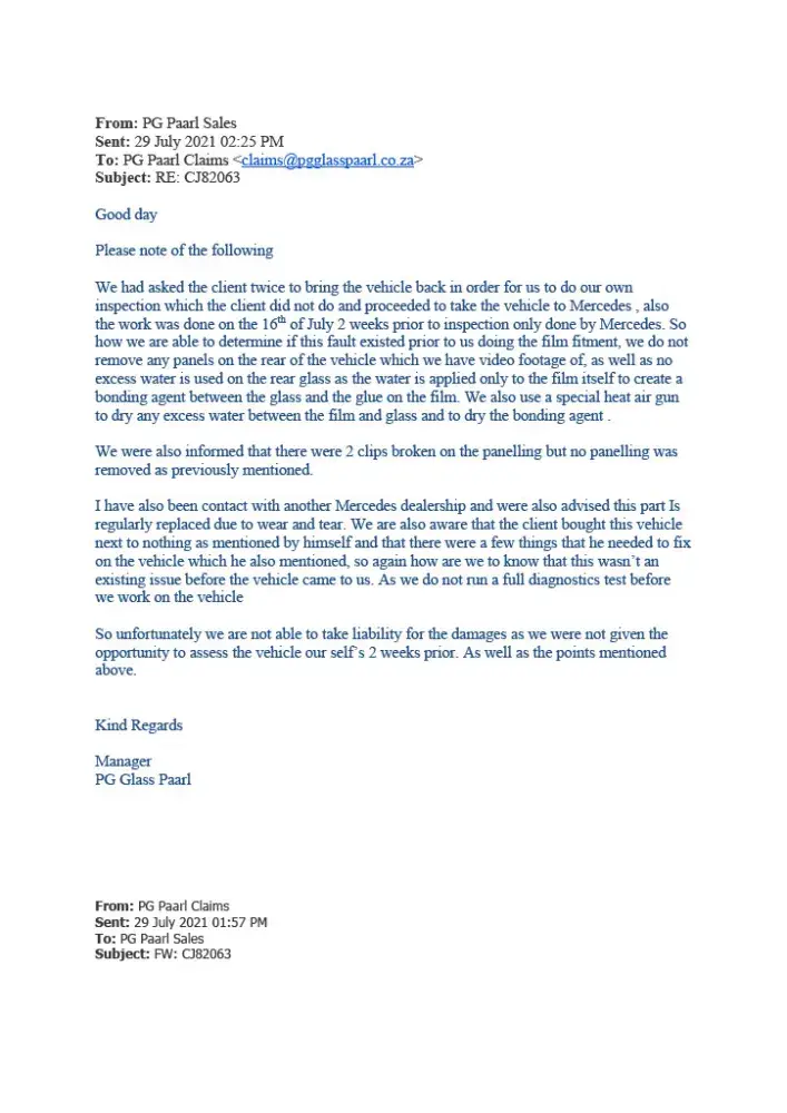 Mercedes reached out to PG PAARL, indicating the replacement cost.