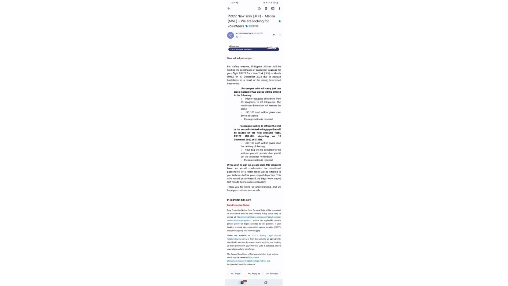 On December 16, 2022, I received an email from PAL asking if I can bring on board one check-in baggage instead of two, I would be issued $100USD upon arrival in Manila.