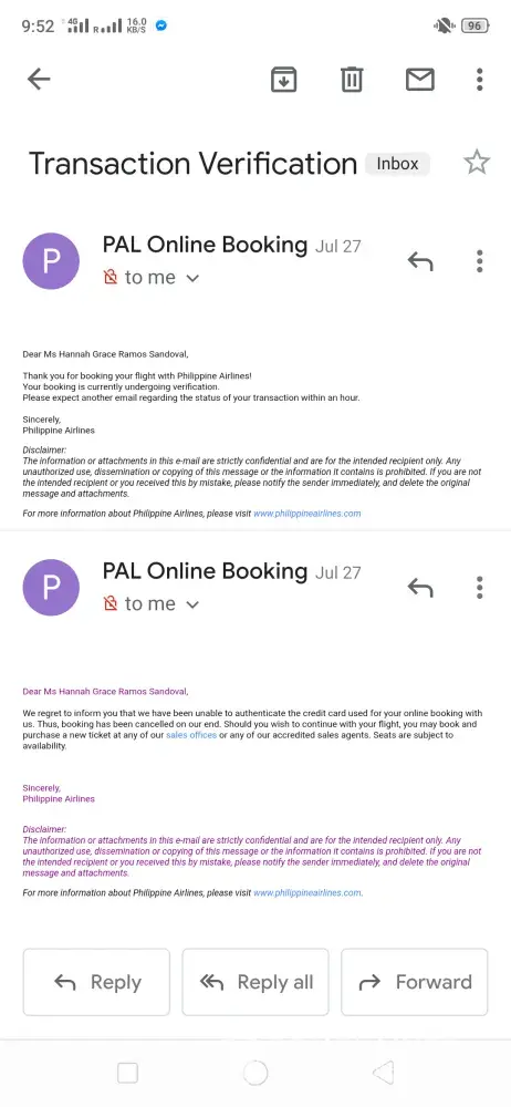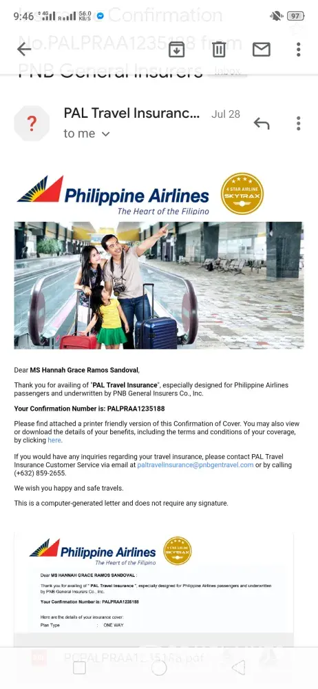 Good day Philippine Airline! Just want to follow-up my case 'PAL Travel Insurance PALPRAA 1235188C. According to the last e-mail sent to me dated 29th of July 2019 it was successfully cancel however upon checking my BDO savings account it was not refunded. Even it's just $36 it's a hard-earned money and I don't want to waste any single cent. Attached herewith are more details for our reference.
