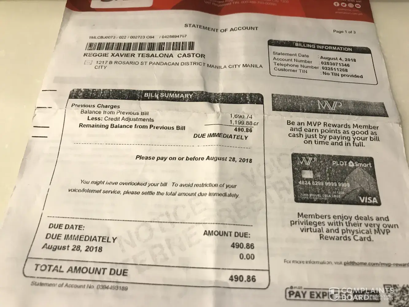pldt landline and internet monthly bill amounting to php 490.86
