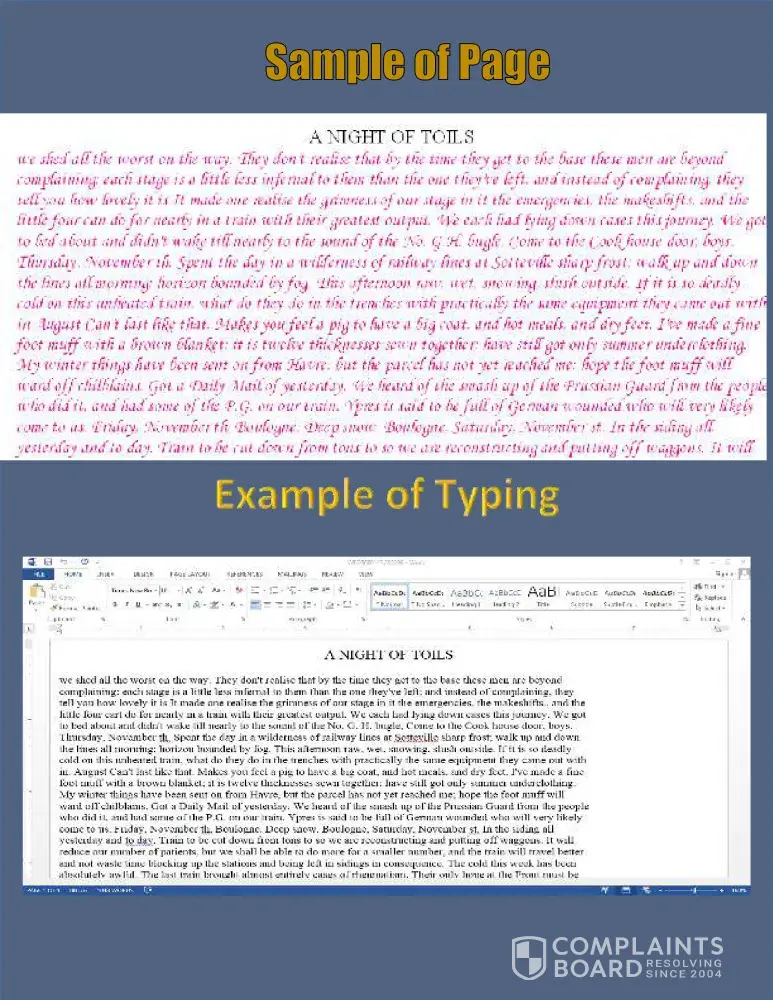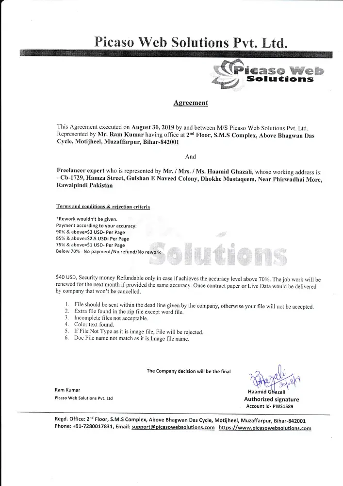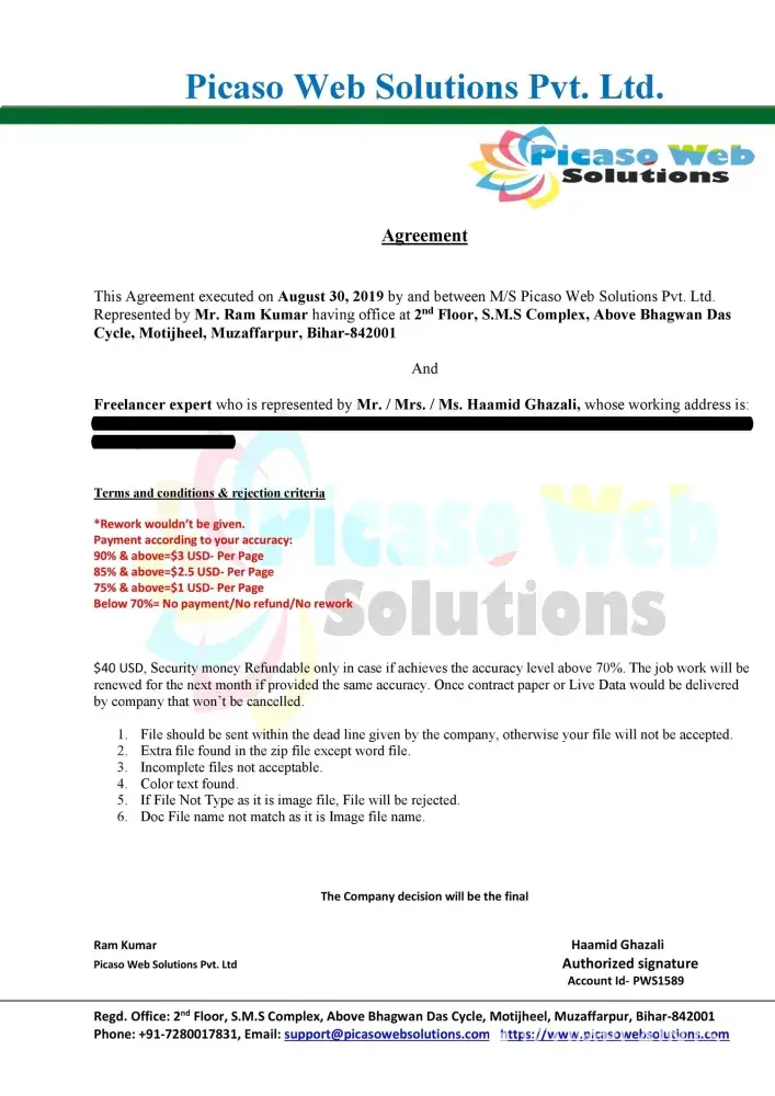 we Have a Genuine Work Report and you already match from your doc files which is not matched and you feel that i mistaken that error so that why you are doing some bad review. and you agreed with all term and conditions when your accuracy of your work goes below 70% you wont be refund and and wont be get your work payment we have a proof of Agreement between us and you signed that deal and agreed with that that all company T&C of Project. if you did and didn't mistake in those files our company will pay you 110% without any doubts but you not done good as per we discussed before starting work. so, all company pay to workers for their good work not for bad work no any company listed in google pay for their bad work if you are not satisfied of your work Report you can email us support@picasowebsolutions.com we will check more page cause as per team they checked that files and error's goes more than 100 in those files.
