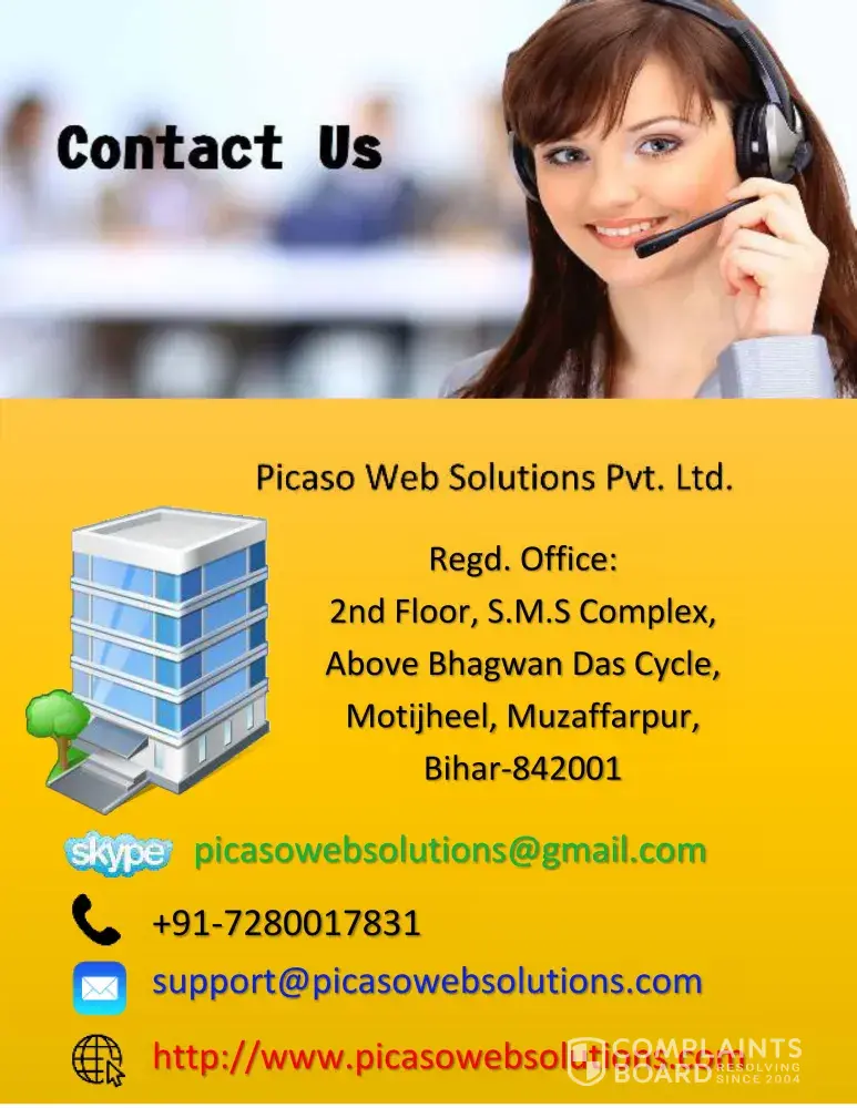Click up if you have successfully reached Picaso Web Solutions by calling +91 728 001 7831 phone number 1 1 users reported that they have successfully reached Picaso Web Solutions by calling +91 728 001 7831 phone number Click down if you have unsuccessfully reached Picaso Web Solutions by calling +91 728 001 7831 phone number 0 0 users reported that they have UNsuccessfully reached Picaso Web Solutions by calling +91 728 001 7831 phone number