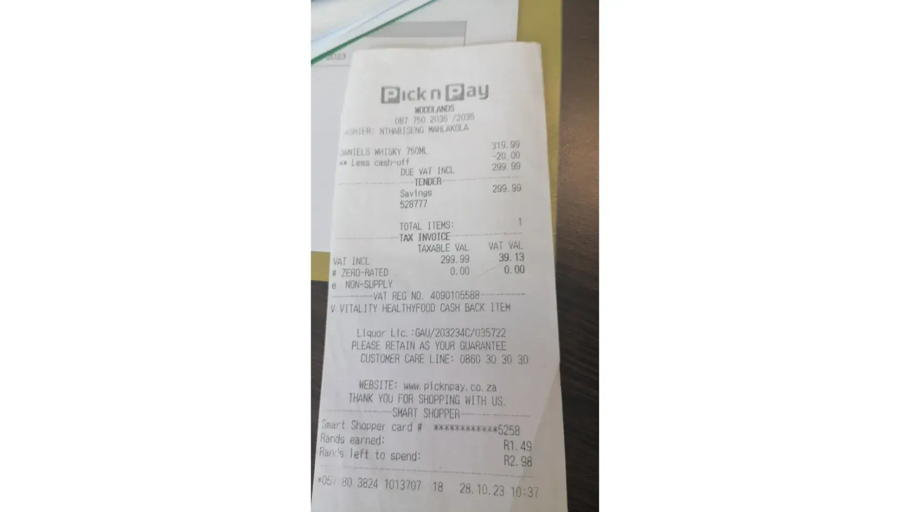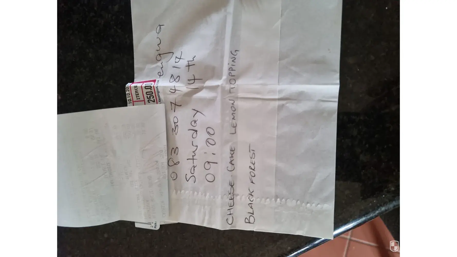 I was given a paper to write my name, cell phone number, my order, and the date and time for collection. I did this, then I was given a receipt to go and pay for my order, which I did. I paid R250 for the cake, and R220 for the cheesecake (as per the slip I had to hand over back to the bakery). On the paper that is in my possession, I wrote that I would collect the order on 14 October (Saturday) at 09:00.
