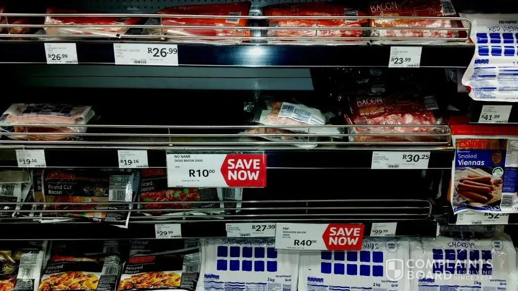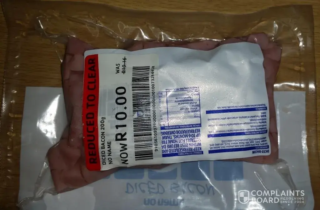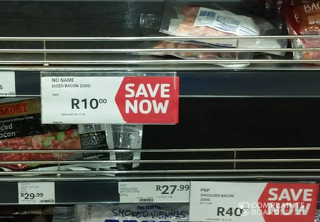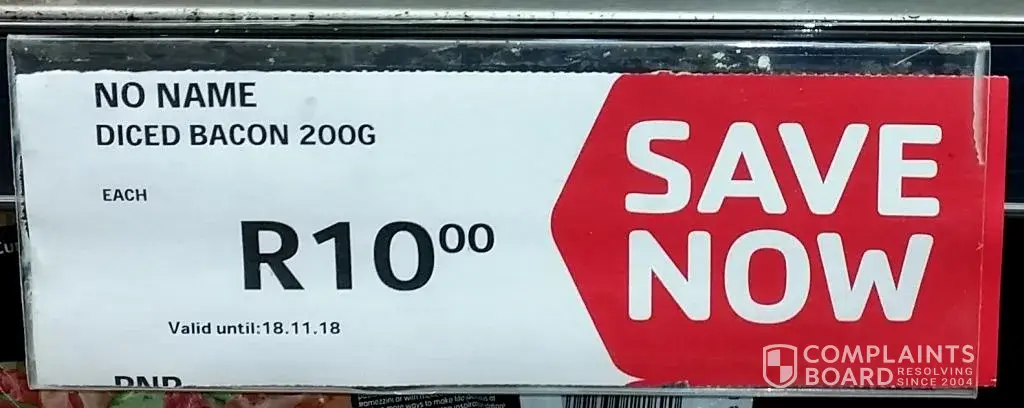 The notice pinned to the shelf stated that your no name brand sliced bacon, 200g had been reduced to R10.00 per packet. I took in total 13 packets and noticed that 3 had stickers stuck to them indicating that the price had indeed been reduced. I re-read the pinned notice to the shelf and was convinced that it indicated that all the 200g diced bacon items had been reduced.