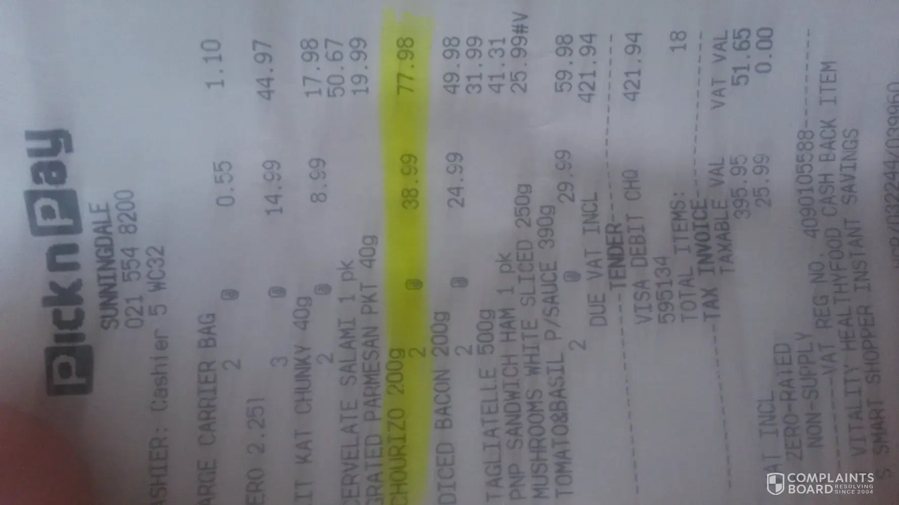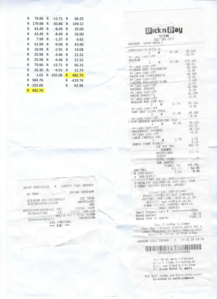 On 19 November 2018 I purchased products worth R482.70 from Pick n Pay Gezina Branch, Pretoria. On each product a discount was given to a total amount of R102.06, thus the total purchase value before discount was R584.76.
