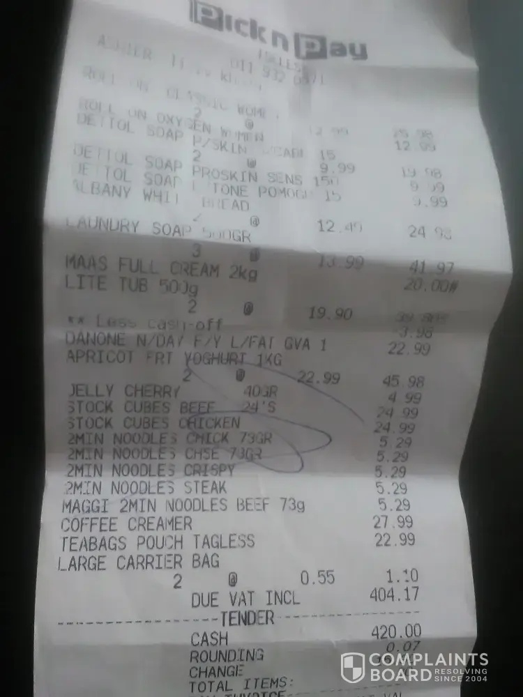 I went to shop at Pick n Pay Tseles in Moletsane Soweto on the 29th of Novemer 2018 and upon checking my receipt, the prices on the shelves and the ones on my till slip are different. Firstly the Maggie 2 Minute Noodles were priced as 5 for R18 and I paid R5.29 each totalling R26.45. Secondly, the Laundry soap were priced at 3 for R30 and I paid R41.97, Thirdly the Blossom lite 500g tub was buy one get one free at R19.90 and I sadly paid R39.80 and lastly the Knorrox cubes were on special at R19.99 and I ended up paying for 2 at R24.99 each totalling R49.98.