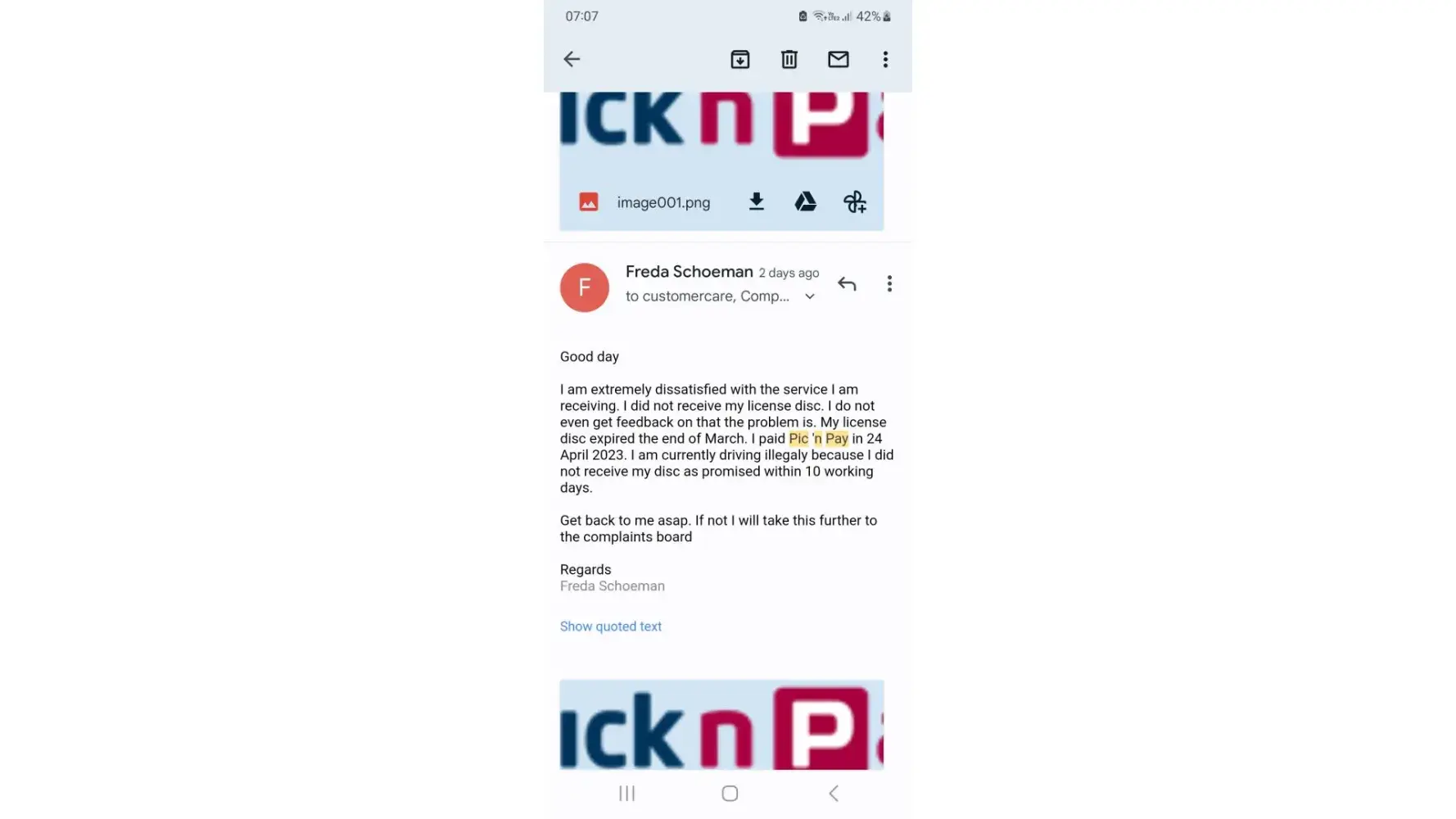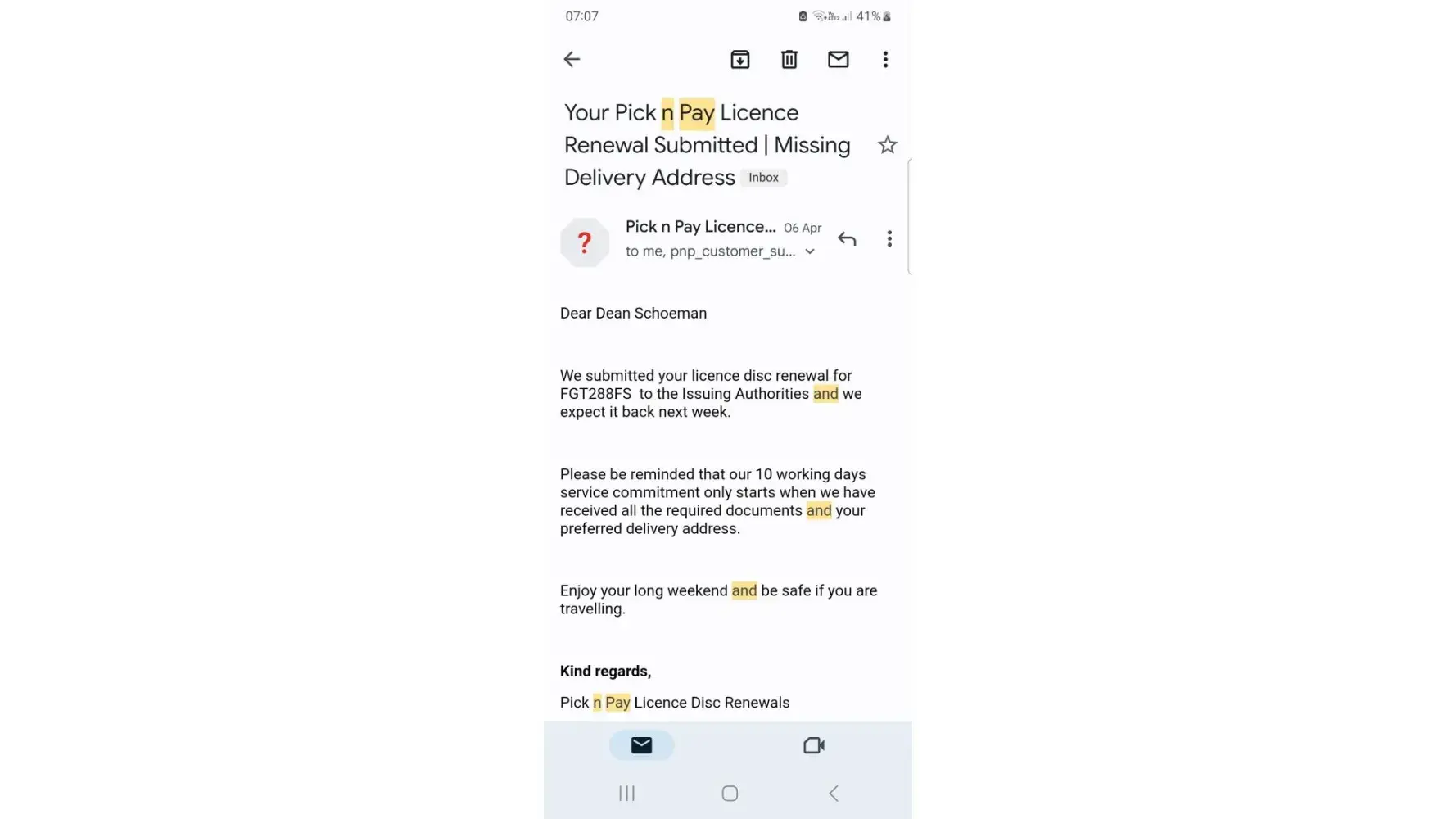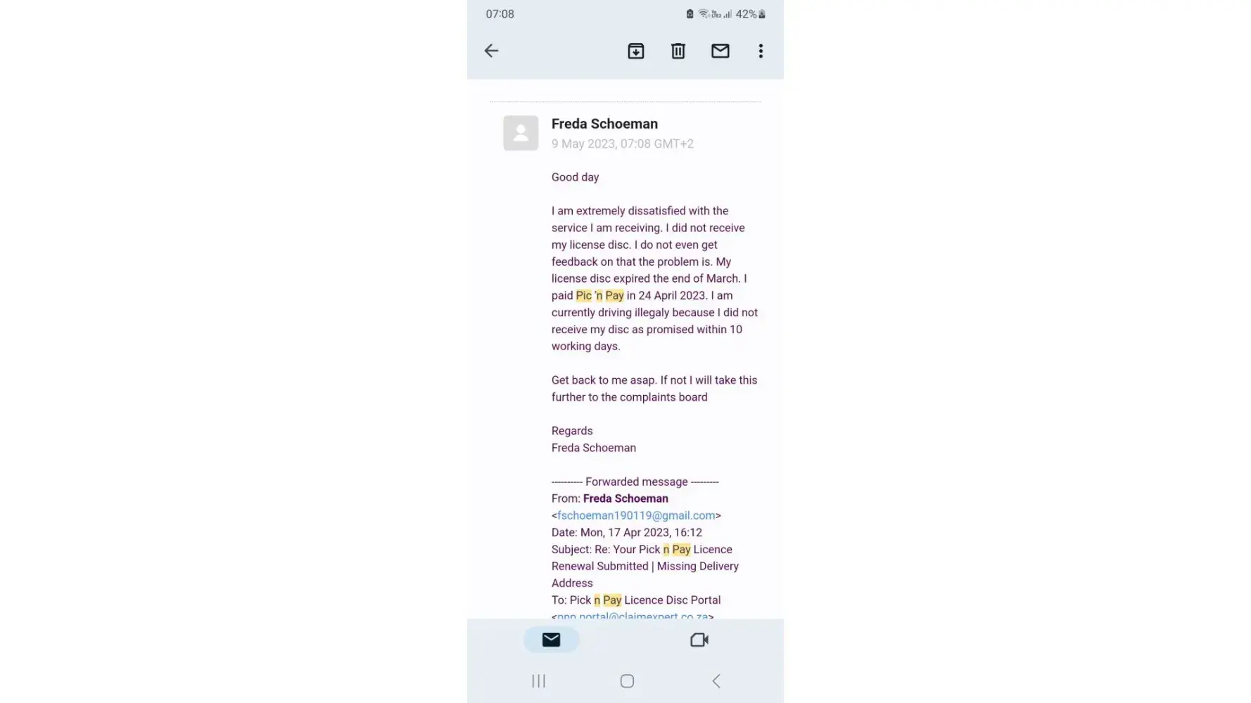 To start with, I just want to bring it under you attention that it is illegal to drive without a renewed license disc. In the event I am fined, I will take legal action. I have applied and paid R915.00 for my license disc renewal 3 April 2023. The license disc was supposed to be delivered within 10 worling days. I have made several attempts to communicate with customer care and the complaints department to enquire as to where my license disc is. But I have received no assistance whatsoever. Attached is the screenshots of my emails on the specific dates.