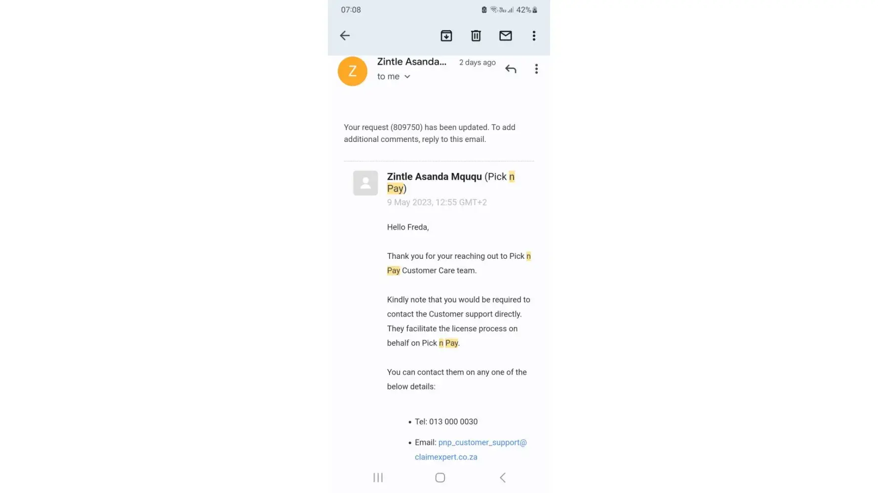 Pick n pay sent incorrect information to my bank and caused my account to be blocked and a fraud alert put on ny name. After I notified them of the error and sent them proof. They still gave the bank incorrect Information causing me financial distress for more than 3 weeks unable to access my account. I even had to change banks in order to access my salary.