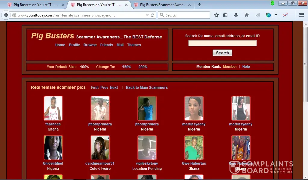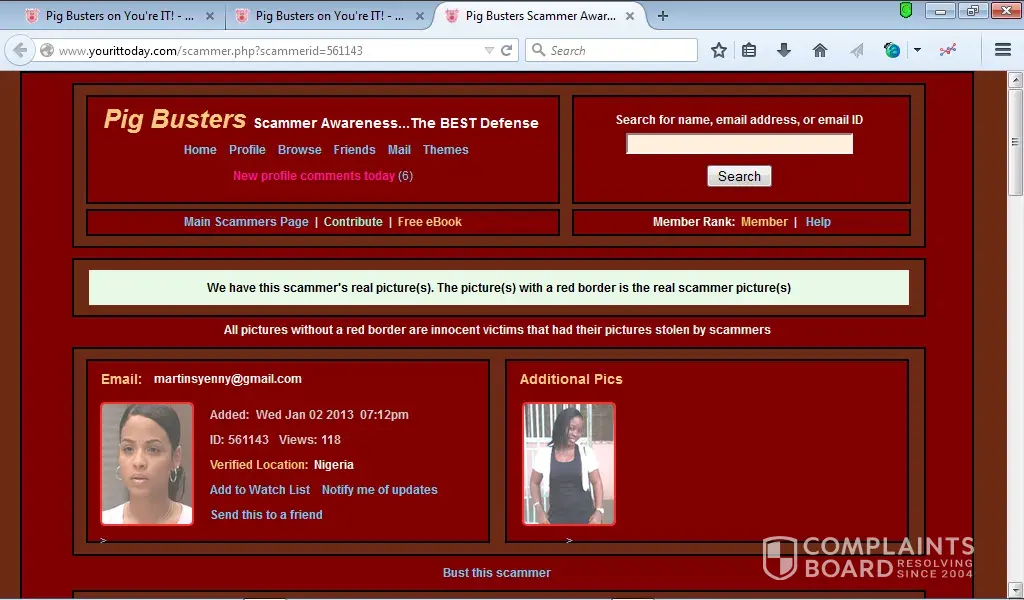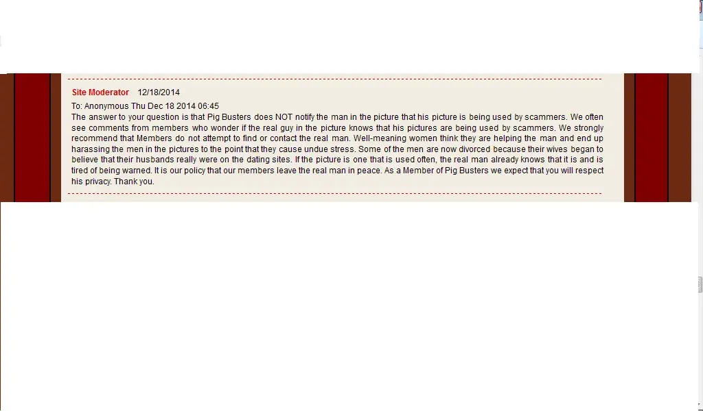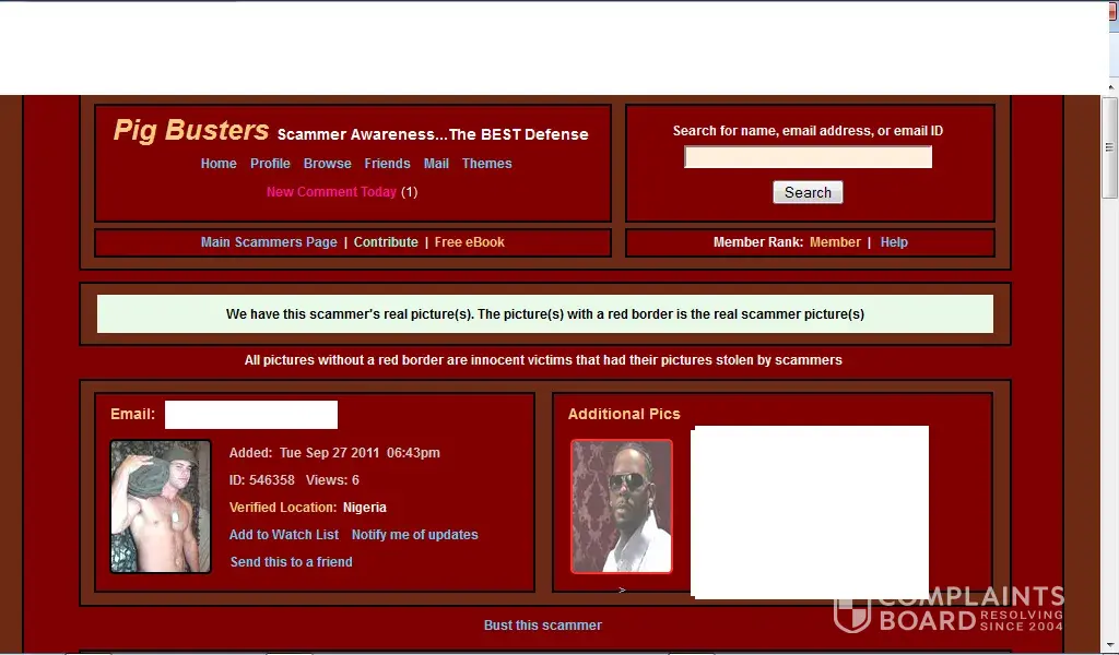 If your image and good name was slandered by pigbusters.net then why did u not file a lawsuit or contact law enforcement? The answer to that is quite simple; because it is a boldface lie and you are in fact a scammer who steal people's identities and turns around and cons hundreds of people worldwide out of money. Pls click the following link from READERS DIGEST magazine attesting to the realness of pigbusters.net http://www.rd.com/advice/relationships/how-to-avoid-online-dating-scams/ As for your claim of harassment, impersonation and identity theft once again WHY have u not sought legal advise or contacted law enforcement scammer?