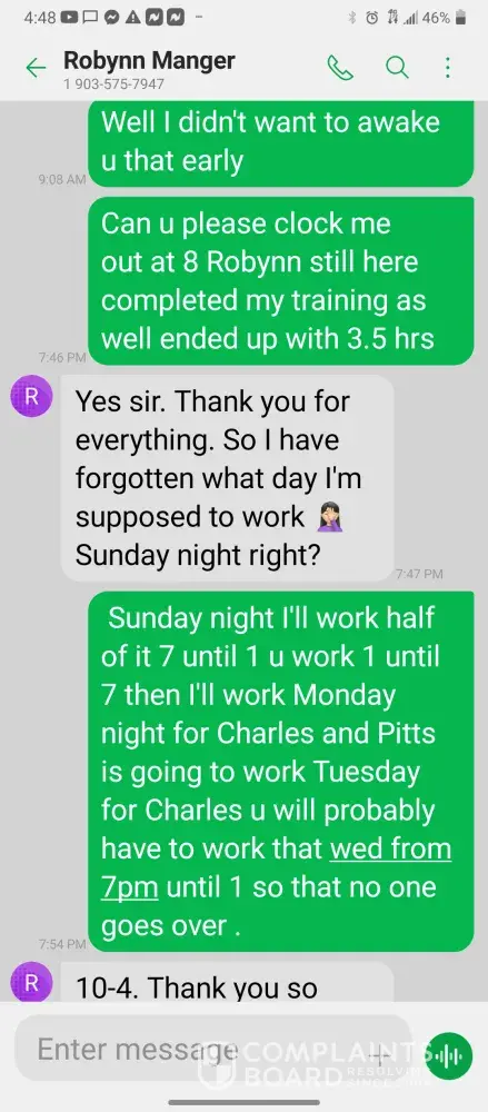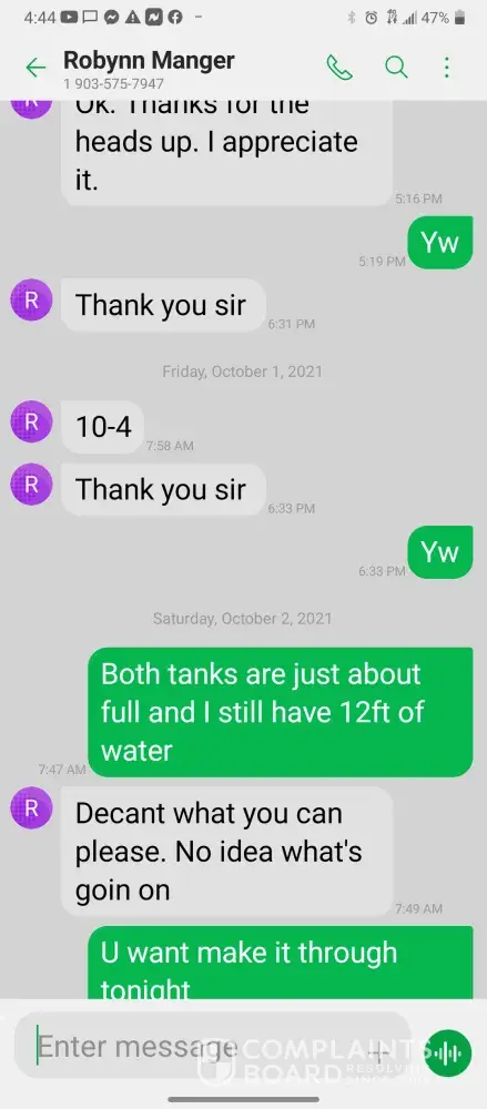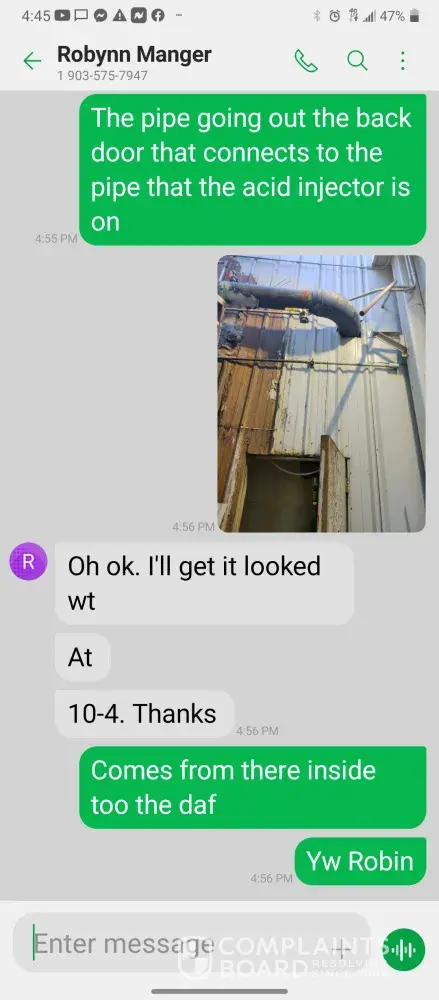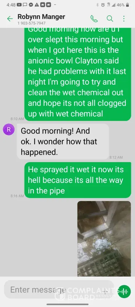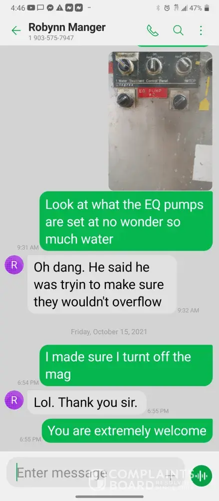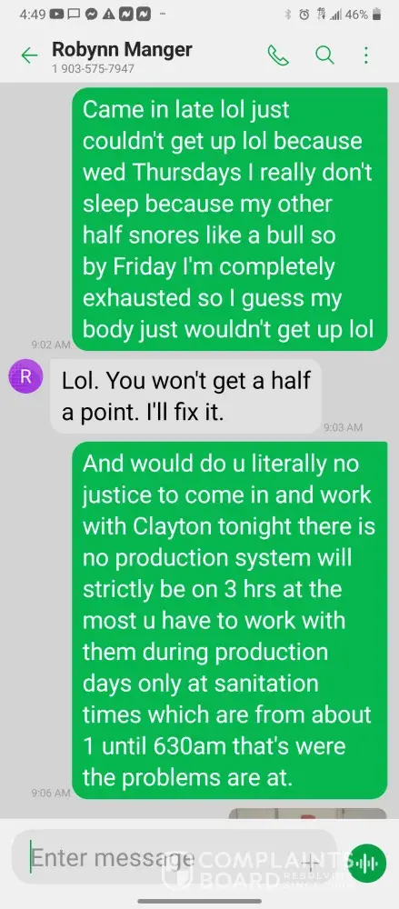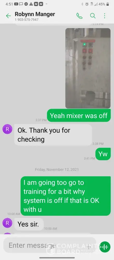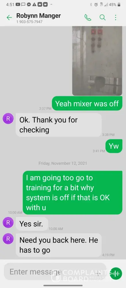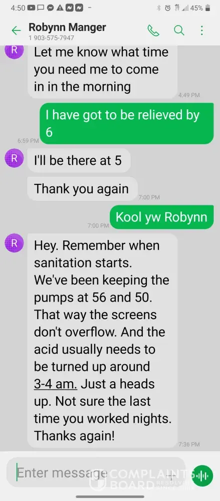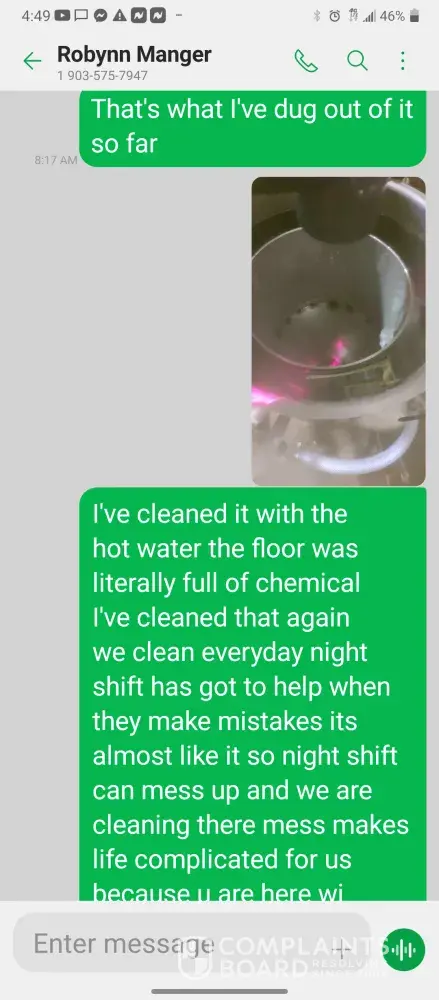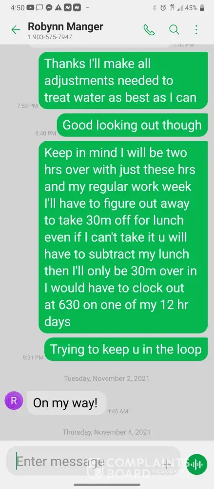 Hello so im james so every morning I get in there is something wrong with the system were im having too come in and fix the problem due too the operator not understanding the system so he just allows the system to run bad waiting for me too get in to fix it. So I did this yesterday as well as today yesterday it took a bit longer figuring trial and era but I finally got it comes in today same thing both ph are at a 10 daf and city so I ended up making a mess trying to get the water too not look like mud so after I got it back right I text Robynn and let her know it was fixed so after that I cleaned all floors while operating system. So remember I had to do trial and era so that means I had to check and clean all probes I also cleaned the turbidity lines and bucket checked all pumps to make sure that the daf was actually getting the chemicals that it should be getting so she comes in and ask me to clean all of those things again that I had ripped and ran cleaning to get water right for the shift before me but when she feel I dont clean she yells at me and right me up but if we read the books and view the camera im always the only one inside of waste water cleaning and operating and fixing things u will hardly see anyone else because they hide were the cameea cant see them are just sat out back pretending to be washing down patio and she is ok with that so today she comes in after ive cleaned the floors takes sludge out of the turbidity bucket and poor it on the floor and didnt even get it up who isn't a slave to clean up her intentionally mess up is ne so then I run system all day so had to go too hr at 3 I told the guy that works back there with me that I was leaving at this time system had 5.9 feet of water he ran it 20 minutes after I left she text me asking me why I wasnt back there when the system is off simply because she wants to find things for me to do but she didn't want to ask the other worker to do it this is pure harrasment and im sick of it i have recordings and ive been told she basically admitted to smoking and I know the camera shows her inside of waste water smoking and nothing has been done at all I proved my write up was bogus and still nothing happens and its foul play on everyones behalf because those careless mustake could have killed us all smoking around flammable chemicals and which she knows better but thinks and believes she can do whatever she pleases and you guys are riding with it until she makes the mustake of a lifetime ive proved she iss careless of others lives and a bullie of a manager and its all been ignored. She has broken all company regulation and committed major safety violation and its ok is what hr is saying basically.