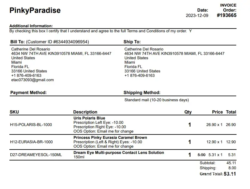 Ordered a pair of contacts from PinkyParadise website and never received anything. Customer service promised they'll find my order, or will send me a replacement, but everything they said was nothing but empty promises. Never received my order or my money back.