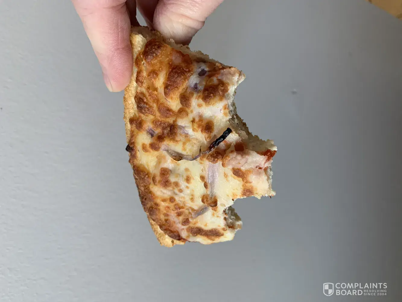 We ordered a pizza and some wings last night it arrived piping hot and on time. We were very hungry and didn't notice there were hardly any toppings on our pizza. My husband took a left over piece out of the fridge this afternoon and had a couple of bites then showed me the cross view of the pizza. There was hardly any sauce and almost zero toppings on...