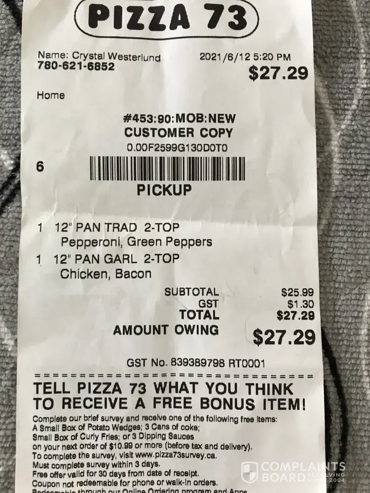 i’m complaining about pizza 73 7 north stalbert I worked there for 11 years as a delivery driver