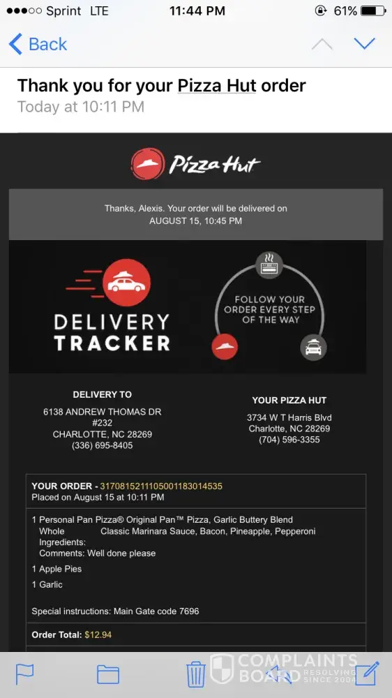 I placed my order ( 3170815211105001183014535 )for delivery lastnight at 10:11 and was told it would be here by 10:45. I called at 10:54 to store #014535 and spoke with Tracy, the current manager on duty, and he said that my pizza was out for delivery next and he was waiting on the driver to get back. When my driver Steven gets to the residence that I'm visiting, it is now 11:17. He proceeds to give me my cold food and I asked him where the garlic sauce I ordered was. He checked his page and he didn't have it and I checked my boxes and I couldn't find them either. He offered to go back to the store and get it, but as I told him.. it is no point because my food will be even colder than what it already is if I have to wait on the sauce. Yes, it is understandable that the sauce is only 50 cents, however, I paid for the item with a purpose for it. I warm up my food and as I start to my apple pies, 2 pies are stuck to each other by chicken skin. At first, I thought it was the cinnamon sugar connecting it but when I tasted it, it was definitely chicken. Not to say I don't like chicken, just not with my pies. I called the store and spoke back with Tracy and told him along with my food being late it was also missing parts. He offered a $5 credit on my next order but considering it's not my local Pizza Hut and I won't be back in that area to ever order from them again, that doesn't benefit me at all and I wanted my money back. He proceeds to tell me that I would need to come to the store to get my money back. This was bothering to hear because the purpose of me getting my food delivered was so that I DID NOT have to go out. Considering that I'm currently temporarily without transportation, it doesn't seem feasible nor logical for me to do that. I spent $13 on a cold, wrong order. Also considering it was my first and only meal of today it's made me very upset and frustrated. And I was still hungry, my food was not enjoyable at all, a complete waste of my money and I'm highly HIGHLY disappointed in my complete experience.