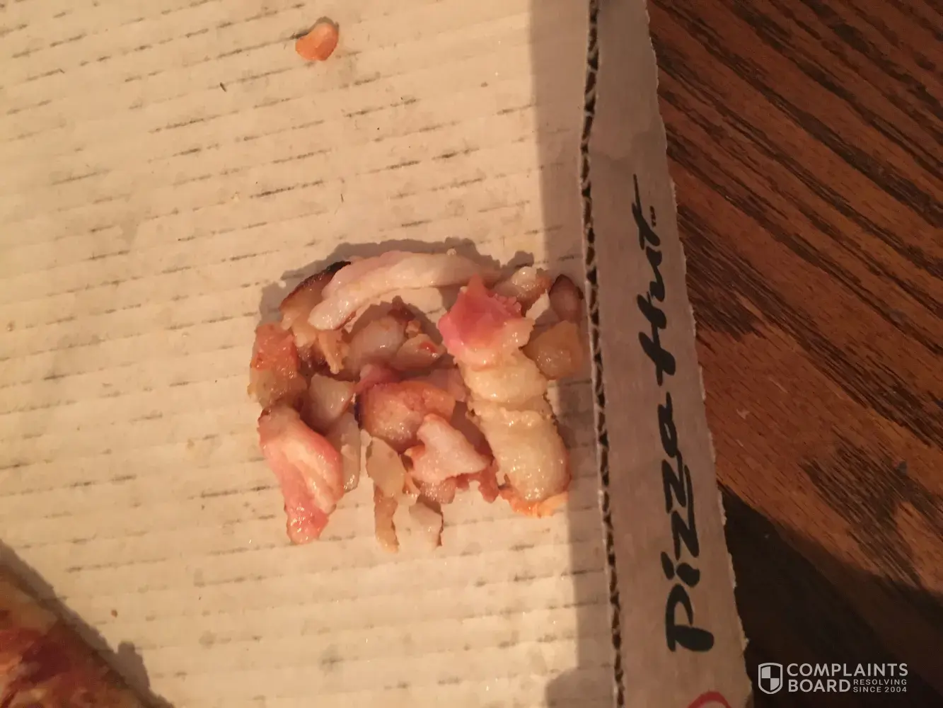 My kids begged for Pizza Hut so we gave in and ordered. They wanted bacon pizza so I ordered EXTRA bacon! and they were super happy when it finallllly arrived (lukewarm). The delivery gal was very nice though. Upon opening the box they were so disappointed that I had ordered pizza with "onions"...(They're just young kids) so I look at the pizza and it did indeed look like onions but was in fact just white, gristly, chewy basically uncooked bacon... and I ended up having to pull off 90% of this bacon before they could eat it, because it was literally inedible. Like chewing on rubber. I can see a few pieces like this but the entire pie? What happened? My girls were really bummed and I'm so disappointed in the quality.