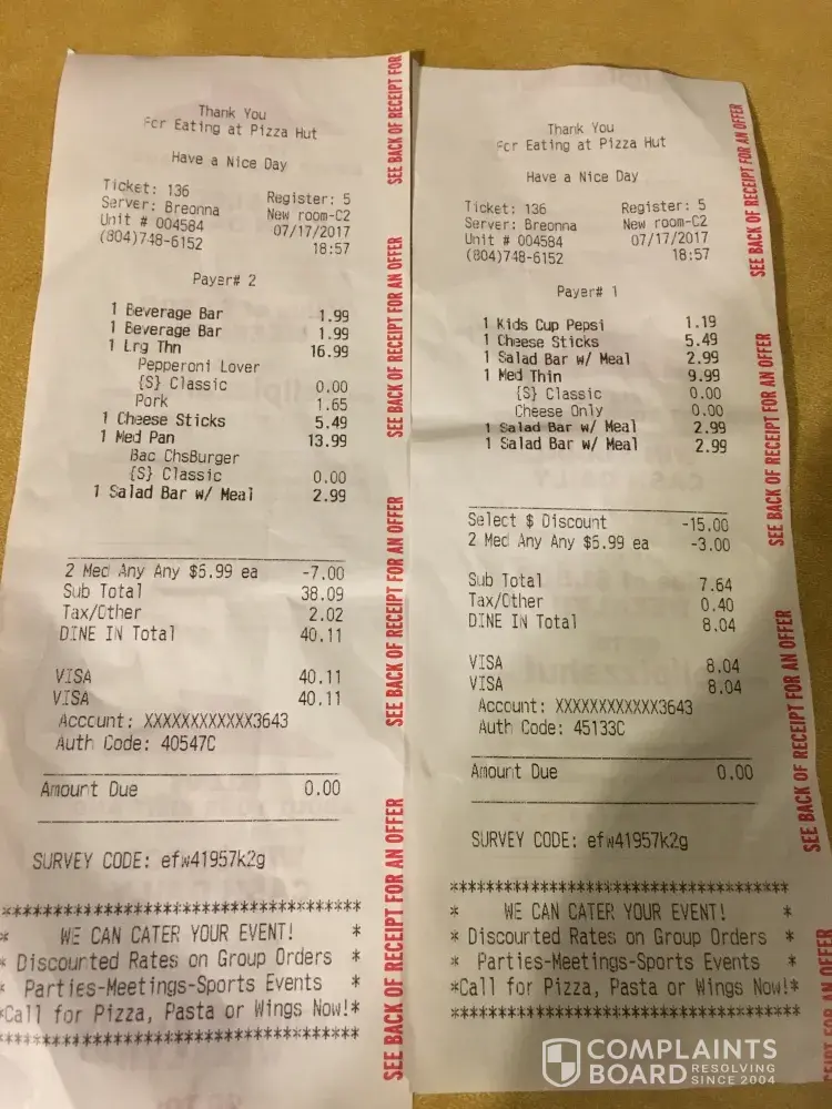 My family went in there tonight to have pizza and breadsticks and salads. The services was HORRIBLE! I just went through this a few months ago at the same location. Someone needs to do something at the Chester Va Pizza Hut. They burnt my large pepperoni with pork pizza. Then the cheese pizza cane out thin and was suppose to be pan. Then my brother ordered a medium meat lovers and it NEVER showed up! We had to get up and ask for salad plates and ask for drink refills. Then we go to split the. Heck and the cashier was so confused I just told her to totally forget it and I paid for all of it. $50 some dollars wasted there tonight! Very unhappy to say the least.