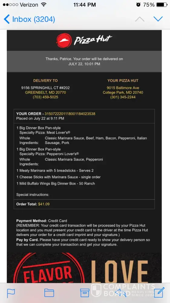 On Wednesday, July 22, 2015, I placed an order on-line at 9:11pm for delivery to my home. The total cost was $41.09 and I received a message that my pizza order would be delivered by 10:01pm. By 10:15pm, I had not received the order, so I called the College Park store and the young lady who answered the phone began asking me the basic questions (name, phone, number, etc) to find my order. While on the phone with her, my house phone rings and it is another Pizza Hut employee (male) looking up my order, which at first he can not find but then he locates itf, he apologies and tells me that the order is on its way. It is now 11:23pm and the store is now closed, I still do not have my food and I think my credit card has already been charged. I tried calling the store before it closed at 11:00pm but of course no one answered the phone. OH, yes, I am very pissed, upset and still hungry! I will not be patronizing this Pizza Hut EVER again! And I will be going on social media and telling everyone I know not to patronize this store. Also, I will be making sure to stop payment on the order.