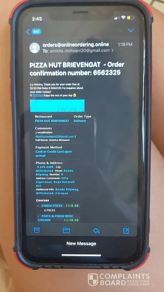 Pizza Hut Brievengat Curaçao - order number 6562325 on 17th July 2021 at 1.18pm was not deliver as according to them, they didn't recd the order but we have recd the confirmation which I posted down.