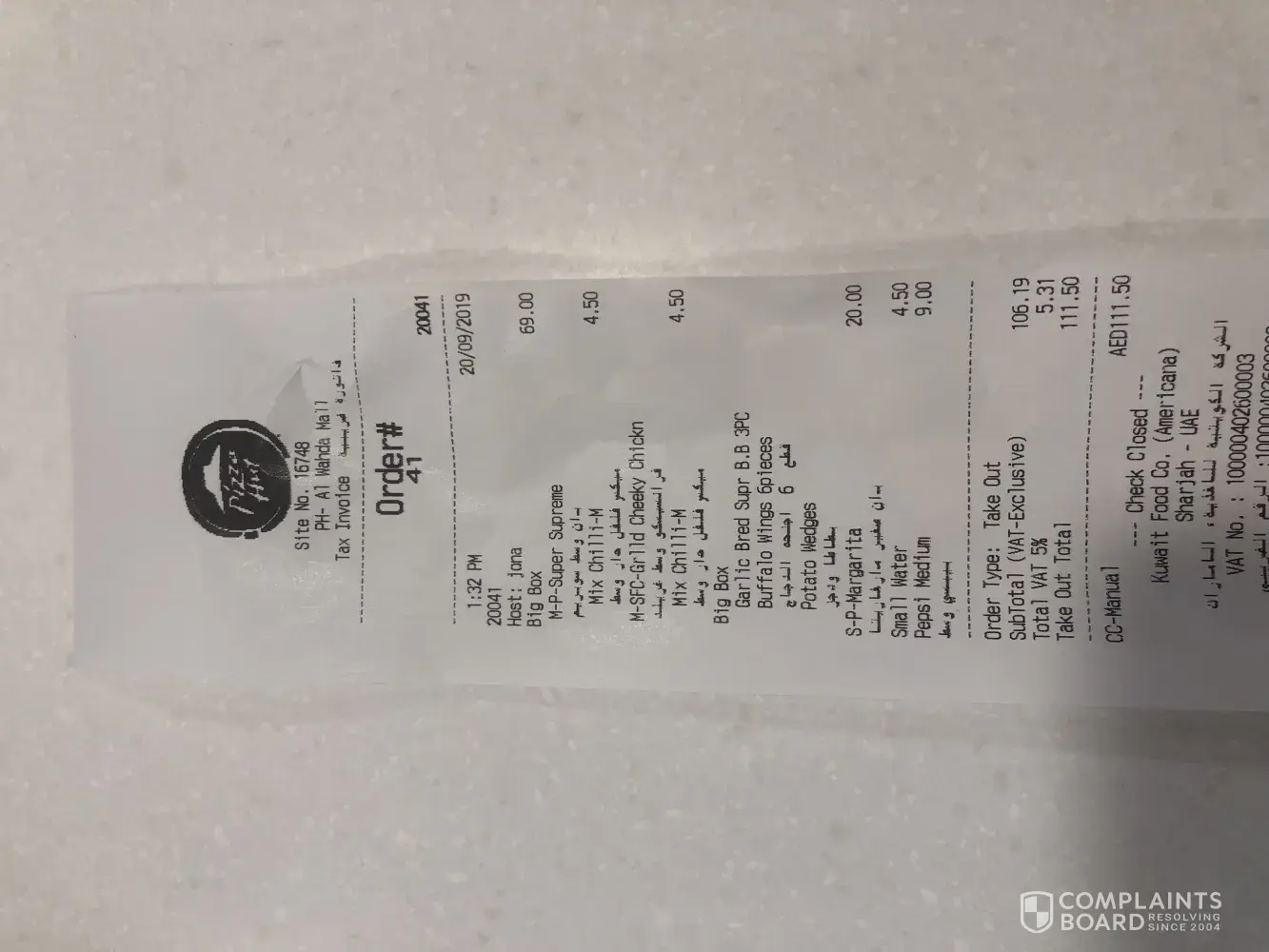 Today at Pizza Hut alwahda mall, at 1:20 pm on 19/09/2019, and you can check the camera.