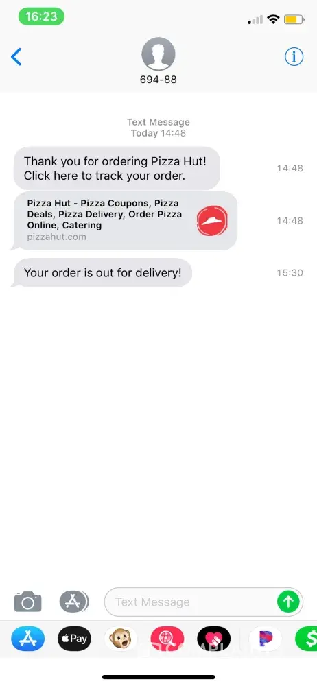 Store 581208: I placed an order for delivery at 1:48 p.m., my food arrived at 4:33 pm. I called several times and kept being placed on hold. One of the several times I called, I was placed on hold for over 15 minutes with no one returning to the phone. I received a text at 3:30p.m. Saying that the food was out for delivery. The experience was horrible.