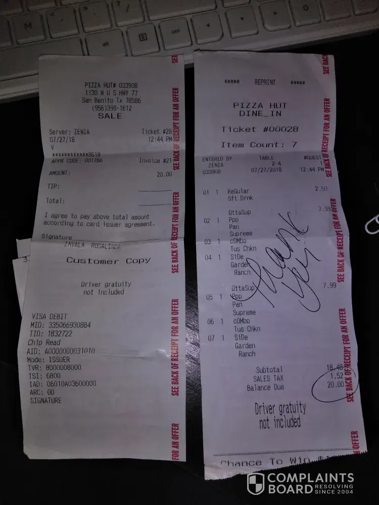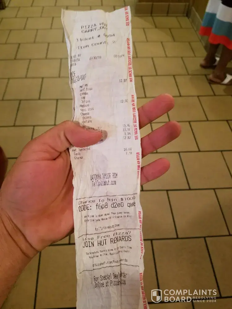 I noticed that for the past 3 purchases that when you all give me the receipt the bottom portion of the receipt that does not indicate the code to enter the online survery for the $10.00 discount. The past two times that I have asked I was told by your cashiers they are just following orders. This is false advertisement, besides being a Pizza Hut freak, i am very disappointed thought I should let you know because when I brought it up at work the same thing has happened to my coworkers. I'm more than sure you all will be getting sued.