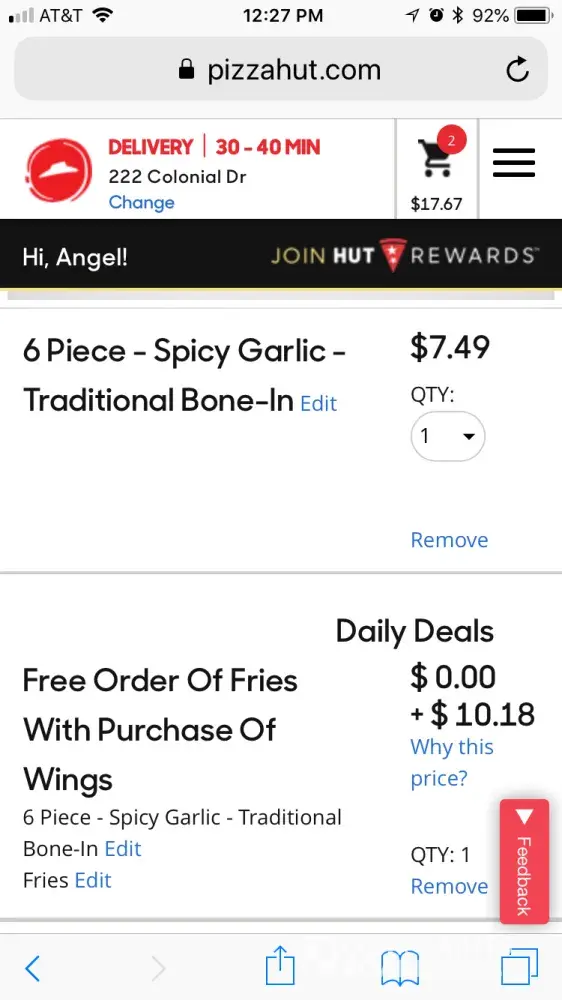 I think that if you are going to have a ‘deal' that says ‘free fries with any order of wings' it should not cost more to order it than to just order wings. I tried to order a 6 piece bone-in Spicy Garlic wings with the ‘free fries' deal and it came to $10 something. But when I ordered just the 6 piece bone-in Spicy Garlic Wings it was $7.49... if the deal is free fries, it should not cost $3 more to get the deal. It's false advertising bc you're still charging for the fries. It should be the same price as the wings without fries. Otherwise, they're not ‘FREE FRIES'...
