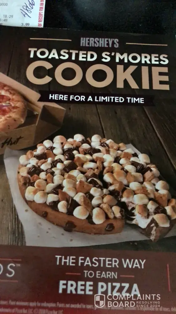 My daughter placed an order we got our pizza and s'mores cookie. When we opened the box for the s'mores cookie there were a couple marshmallows on a small part of a chocolate chip cookie and that was all. When we called the store to talk to them about it we were informed the cookie was so popular they had to cut back on the ingredients. This is not very good business. Called back because when I asked to speak to a manager I was disconnected. Manager told me they would get another one sent out I told her didn't want another cookie from the same day because they were not made right. Guess we can add Pizza Hut to most of the other food places not caring to much about there customers. I would like a response back that is the least your complaint department could do besides just reading this