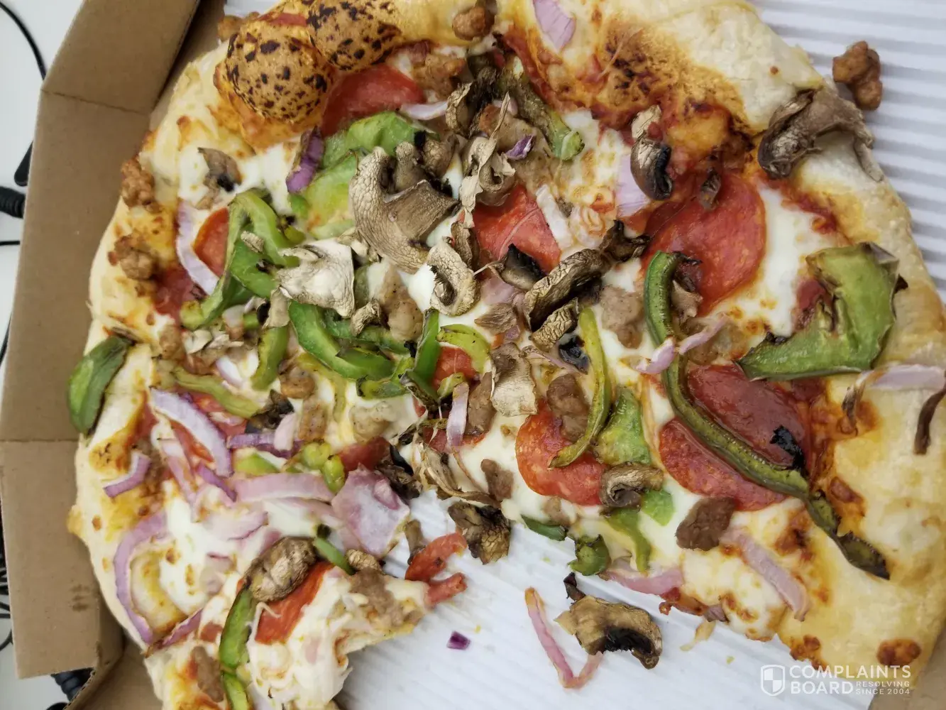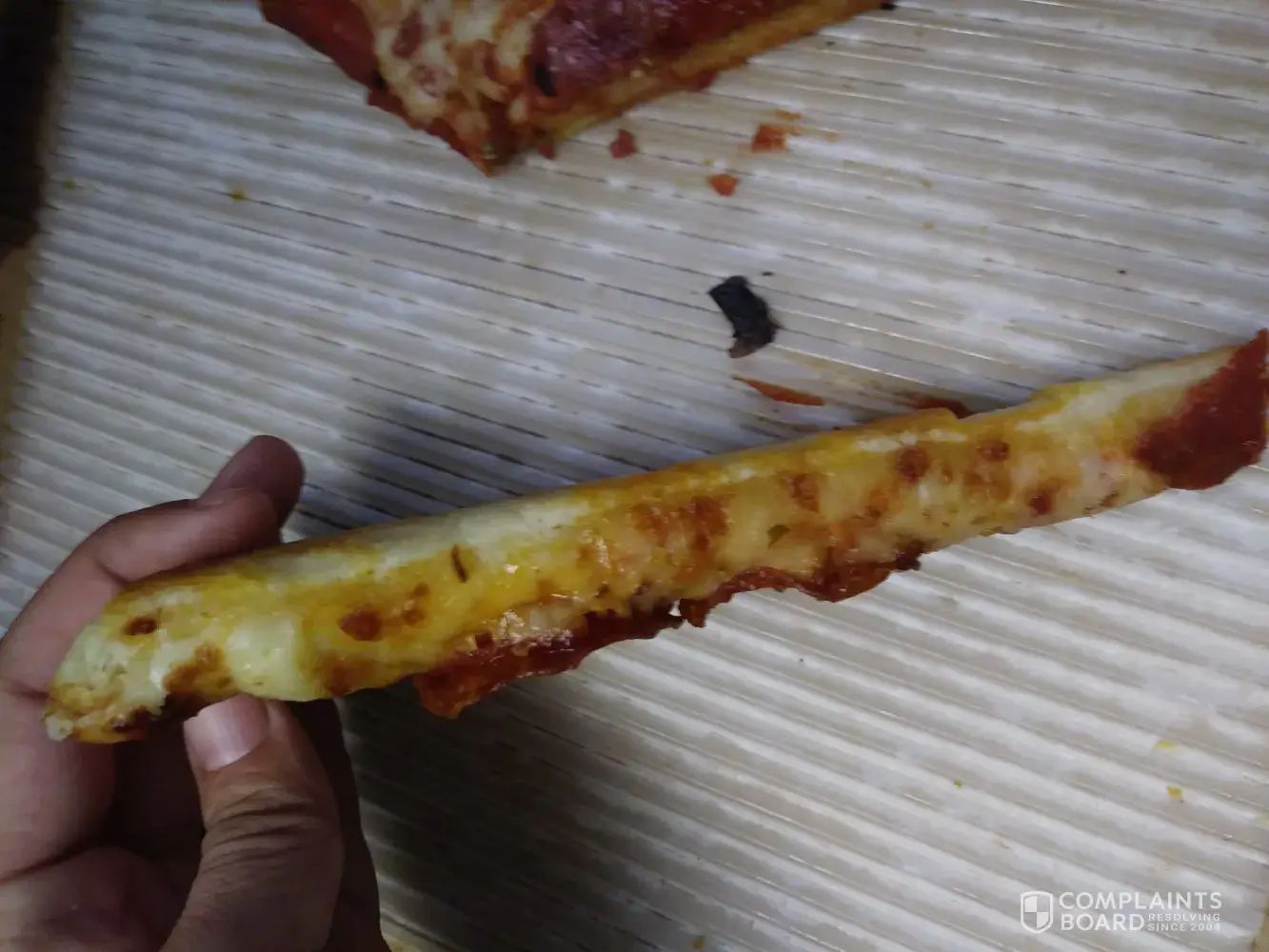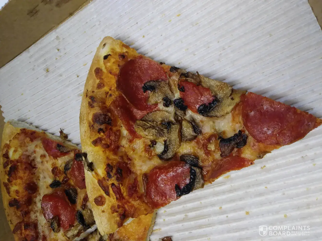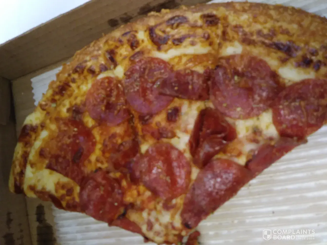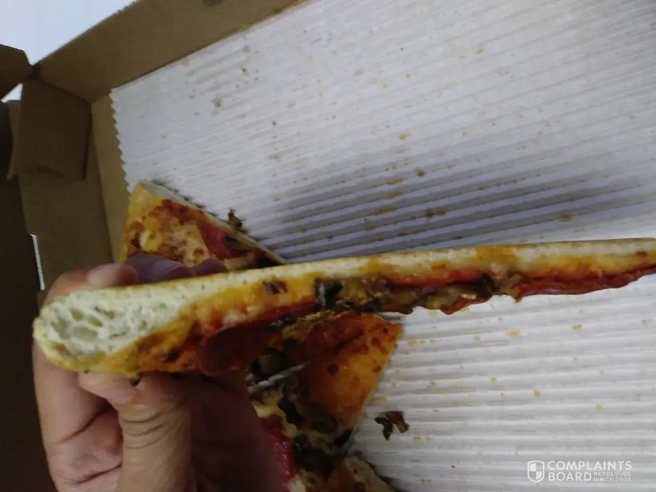 I ordered a dinner box and picked it up. I saw the girl at the counter look at it so I assumed it was okay. I was very wrong! I am enclosing pictures of what it looks like. Awful. The manager told me I needed to drive the pizza back to the store so she could see it with her own eyes, lavinia is her name. I have 2 broken wrists with casts on. The fact that I made it to the store the first time was painful enough, let alone the 2nd trip.