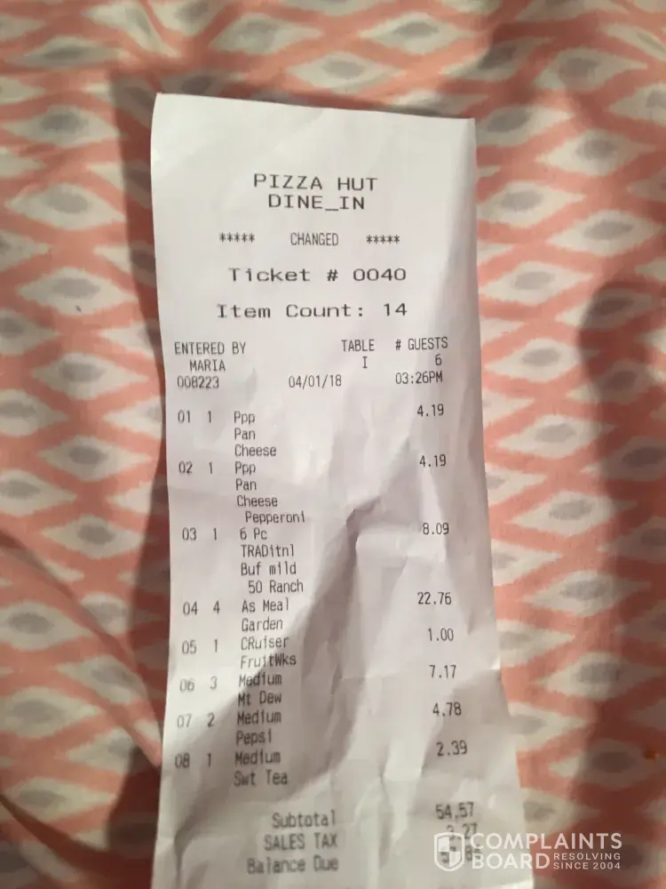 I went out with my family on Easter April 1st, 2018 around 3-4pm in Maysville Kentucky's Pizza Hut. This Pizza Hut has a bar down the middle for food to be placed in when we arrived at the establishment the food was displayed and still under the warmers. My family a quite huge one at that decided this was our best option so we told the waitress this was what we wanted and she apparently misunderstood what we had meant and assumed the salad bar was what we meant. After taking our order she moved to the middle bar area and removed all the food we assumed she was replacing the food with fresh food. After waiting with a toddler and newborn getting very restless for more that 30 minutes my two brothers personal pan pizzas came yet no food had been placed back in the middle. My family was getting quite restless and after they finished the pizzas (4 of my family members had ordered this including myself) the bill arrived two of us had not eaten anything the other two had some salad I asked when the food would be replaced so we would be able to eat. The waitress was very rude and disrespectful with her response to me saying "thats not what you ordered" this issue could have been resolved very easily by some simple explanation in the very beginning or even a simple polite answer. I walked up to the counter to pay a $57 dollar bill that I never received any food at all for myself or my father and salads for my mother and sister and asked how I would file a complaint to Pizza Hut because of the waitress I was not loud and I spoke right to the person who was behind the register. This resulted into when I walked away the cashier and manager announced very loudly that I was complaining to the waitress who then decided to yell at my parents who were ahead of me since I was packing up my newborn. This service was horrible and disrespectful and this entire time the manager was standing right by the register saying nothing to the waitress. As soon as I got into my car I called to make a complaint and I spoke with someone for over 20 minutes who I gave my number and Email to and was assured I would hear something back by that it might be two-three days well this I now day 5 and I have heard nothing at all so I am filing this complaint officially online. I will also add this is my first and last time eating at the Pizza Hut in Maysville I have a Pizza Hut in my home town of Flemingsburg KY that I have never had an issue with and I will always return to. At this point I would like a refund for my food simply because some of my party never ate and how disrespectful I was treated.