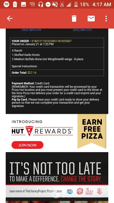Pizza HUT #023257 date 1/26/18 invoice#19