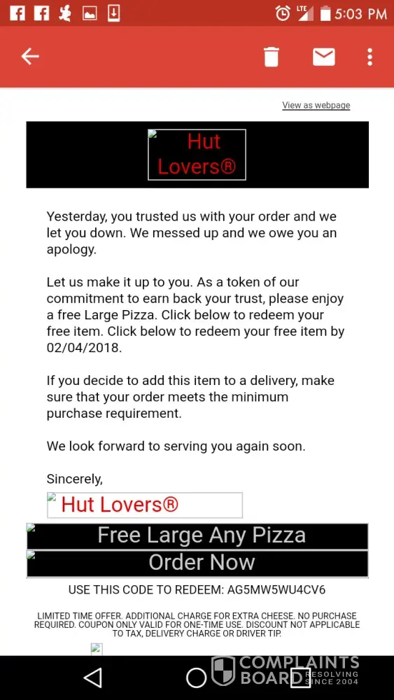 So I get an email for a free Large pizza for long delivery time. I try to use it and my order even says FREE and I am still charged. I have been calling the store for 2 days and none of the call center people can help me. Then when I am put through, the phone continues to ring and then hang up. They just left me on hold for 15 minutes. I cant believe this is the definition of customer service.