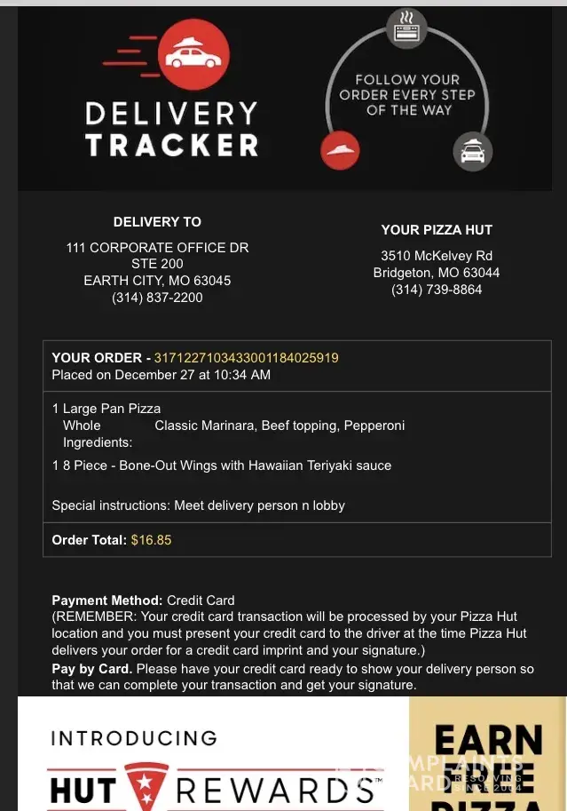 Hut: We don't have a driver. I called everyone that placed an order (NEVER GOT A CALL)