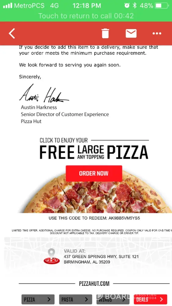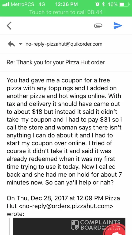 You had gave me a coupon for a free pizza with any toppings and I added on another pizza and hot wings online. With tax and delivery it should have came out to about $18 but instead it said it didn't take my coupon and I had to pay $31 so i call the store and woman says there isn't anything I can do about it and I had to start my coupon over online. I tried of course it didn't take it and said it was already redeemed when it was my first time trying to use it today. Now I called back and she had me on hold for about 7 minutes now. This is the store on Green Springs in Birmingham, Alabama 35209 So can ya'll help or nah?