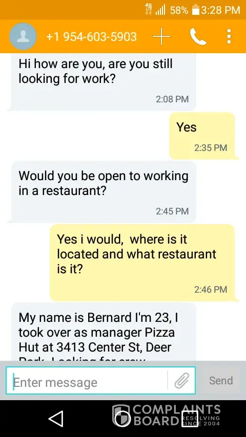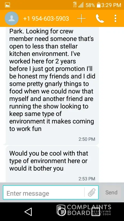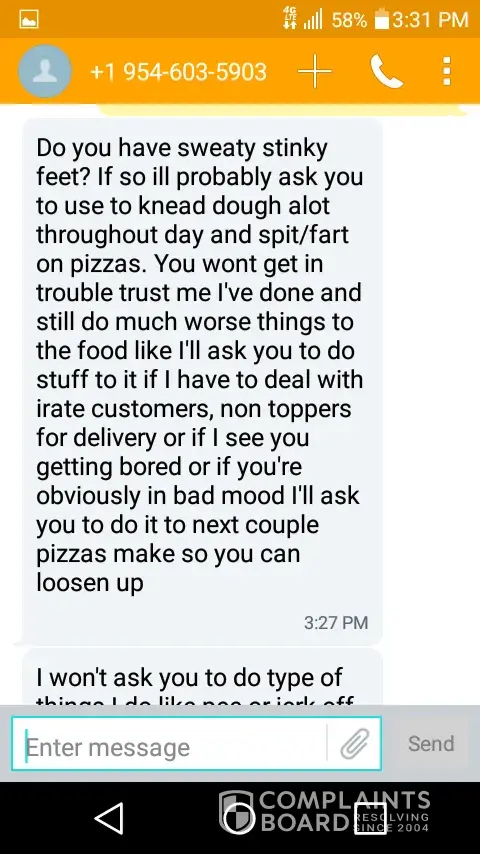 I was contacted by pizza hut over here in Houston Texas, and was offered a job, but while be offered the job i was told that they mess with the food and masterbate into the pizza sauce of rude customers. I have the texts of the conversation between the manager there, If there is anyways i can shoe those as proof. He told me that his name is bernard and he is 23 and is the manager at the deer park location on center street.