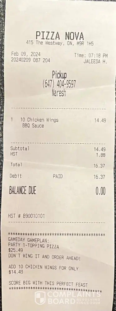 - Despite a high level of trust, our investigation found issues with Pizza Nova Take Out's service, including poor customer service, lack of accountability, and responsibility to resolve complaints. Customers may face long wait times for responses, receive generic or unhelpful answers or no response at all. Only 25% of 0 complaints were resolved.