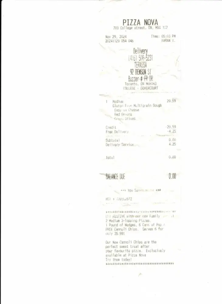 We ordered from Pizza Nova today (July 14, 2023) at approximately 3 pm EST.
