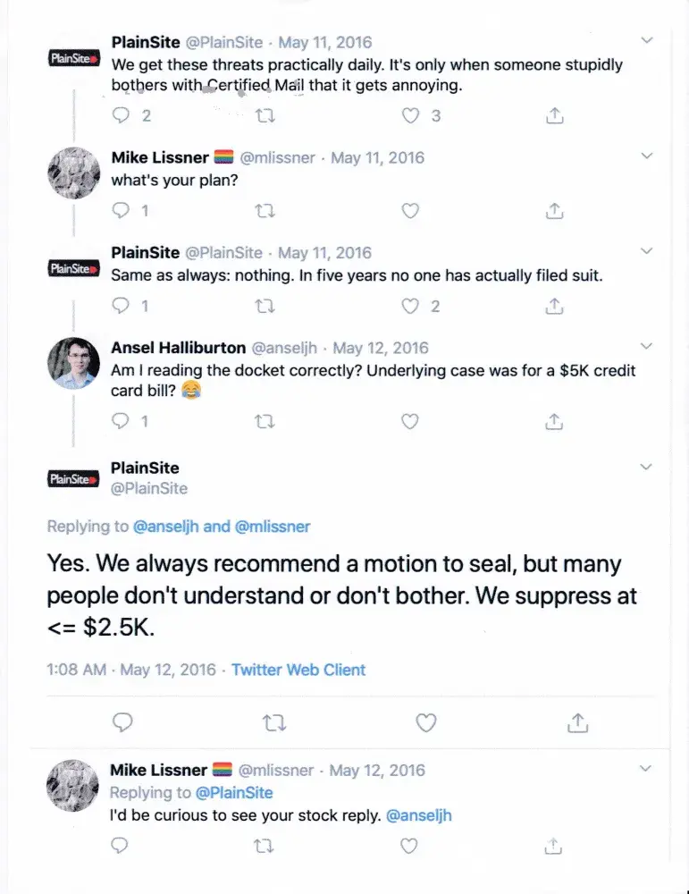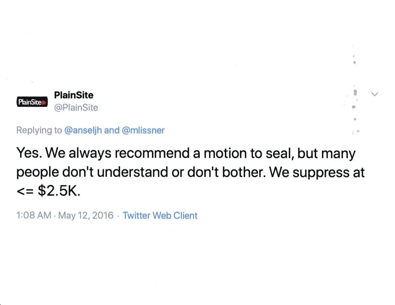 Aaron Greenspan dedicates his time to data mining people's personal information and then upload this information on plainsite.org. With this highly sensitive legal and personal information Aaron Greenspan then uses various techniques to make money. One is to offer to remove the legal documents on plainsite.org for money, as Aaron Greenspan himself has written several times on his Twitter accounts @AaronGreenspan and @PlainSite. One example is from May 12, 2016, Aaron Greenspan literally writes, "We suppress at