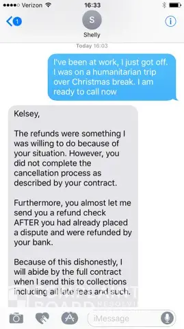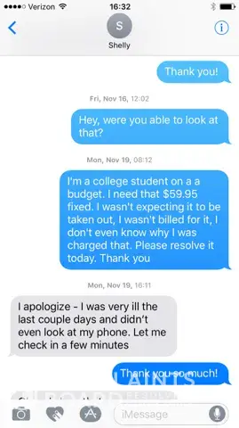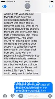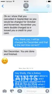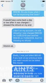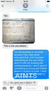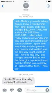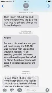 I have attached all of my text messages with Shelly (the "Billing Manager"). I've also attached the cover of my dispute form that I filed with my bank to show the time stamp. On November 15th I texted Shelly after trying to get a hold of someone over the phone numerous times previous days. I politely inquired about why I was being charged $59.95 on November 9th which just so happened to be my birthday (might I add). I was never billed for that charge, and to this day, I still have no idea why I was even charged it. An hour later, she said she would look at it. The next day, I texted her again and asked her if she was able to get it resolved. No reply. November 19th, I asked her if she could please get it resolved. She then replied eight hours later and asked me to excuse her because she was ill and couldn't look at her phone. She then said that I would not be charged for December and that I would be done. (Thus, voiding my contract with Planet Beach, correct?) On November 26th, I had still not received a refund or reimbursements. I texted her that, and she just replied"Hmmm ok." I should have taken the issue to my bank then, because on December 3rd, I was charged another $60.95. Please feel free to look at the texts. Monday December 3rd, I could not go pick up a check at 8:00pm. That just seemed very questionable and to me and I didn't want her having my card information anymore. I've attached the time I filed the dispute with my bank which was at 4:01pm. I texted her at 4:22pm just enough time for me to get home. I let her know that I had filed a dispute with my bank to make sure that my information was protected and that the mistakes wouldn't happen again. She said that I had broken the contract, but there is proof in these messages that I was not bound to any contract in December. In addition, I never received a contract in email or mail. I was never billed $70, I never received a bill via email or mail. I just don't understand what grounds Shelly has in charging me this $70 when none of this was my fault to began with.