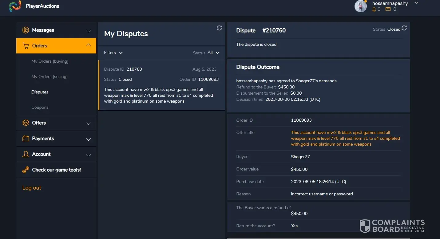 Hello Playerauction my username-mastarmedia i am seller my order id-[protected] i am waiting from 3 days buyer bought the account and changes everything and now buyer claiming but details didnt work now he asking refund i am stuck in dispute for 3 days i have already given him full login details and mail working and correct even sent proof on dispute my account is already taken by buyer please help me with dispute i am stuck on both side he even taken my account and on money dispute as well please have a look