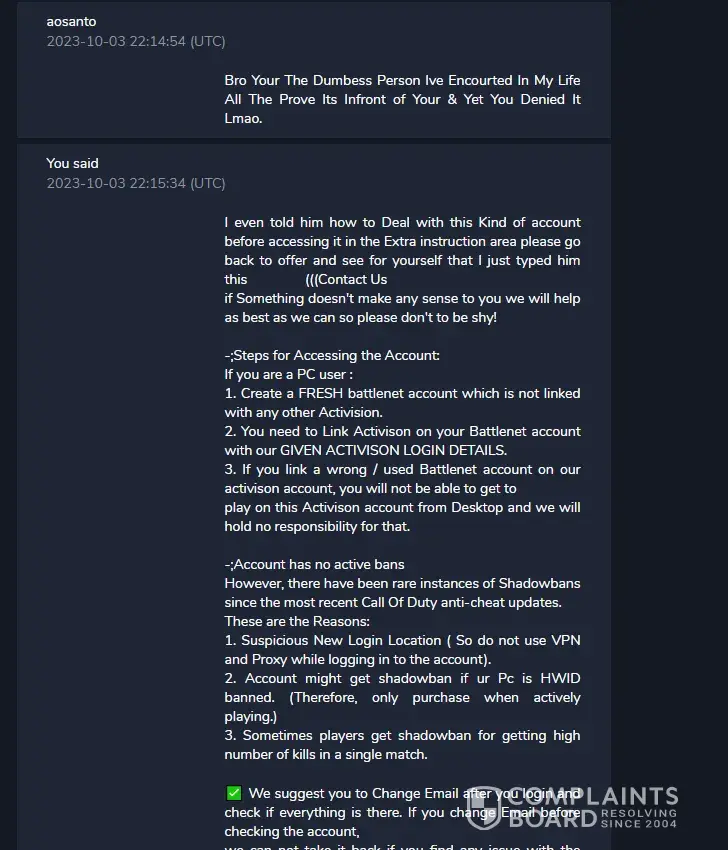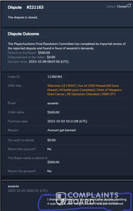 Relogin, account was perma banned) now he got my account working with no problem and checked it twice found nothing faulty in it everything working and came as exactly how I described in the offer once he changed the data the account got perm ban now I provided him with every instructions to how the access the account for not get any type of ban and from cod (call of duty) policy it gave us clear rules why the account get ban so as example you have 2 type of ban shadow ban and perm ban for shadow ban you may get it from open the account with different ip this may last from 4 to 7 days and get unblocked and account working fine with no problems at all. Every cod player know this in his situation he got perm ban so the perm ban comes from this it ain't my talking it cod policy please have look at it - (https://support.activision.com/articles/call-of-duty-security-and-enforcement policy)-now you can see below in picture 1 that's my account just before I post it in pa it says no ban detected at all the games in the account now look for the 2nd picture from cod policy it says below types of perm ban in cod policy there is no way from changing emails to get the account perm ban okay and even posted picture before clarify my account didn't have ban before selling it to anyone and the buyer from beginning stated he checked the account twice you can see that in the 3rd picture for yourself below clearly say this. Now we know changing mails don't get the account to get banned see the 4th picture please he put this in the dispute so the only type of perm ban is due cheating or maybe having unauthorized software on his pc we don't know what have he done so we kept talking on an on with no solid ground and he posted this see it for yourself 5th picture please. He changed all the data of activision and battle net he changed everything now I don't have access to anything at all so now maybe the account get ban or maybe not we don't know so I said to him is this. Where is the ban email which is sent to you in own gmail he said this at picture numb 6 and showed this to the pa support team that activision sends email notify you the account is banned due to cheating or whatever at picture number 7 and we kept talking and he even insulted me with this at picture number 8 and even he tried to bribe pa team with this which I am quite shocked at it at picture number 9 and I even posted this on reddit and post got taken down because the moderators remove it I don't know for what reason to be totally true you can see for yourself here - (https://www.reddit.com/r/CallOfDuty/comments/16zm52c/cod_what_is_titles_ban_in_call_of_duty_warzone_20/?rdt=38093)- so now pa team decided this issue in the buyer favor so now buyer have the account working and have the money and I didn't get my account back after all so now pa team even congrats me with 50$ penalty and removed all my offers from my store which you can see for yourself at picture number 10 and my store with no 0 negative feedback none. I'm quite shocked to be honest and devastated I don't know what to say please look to this again it must be something wrong. It can't be for any scammer comes have the account change the data and ask for refund and they just give them the money i'm shocked.