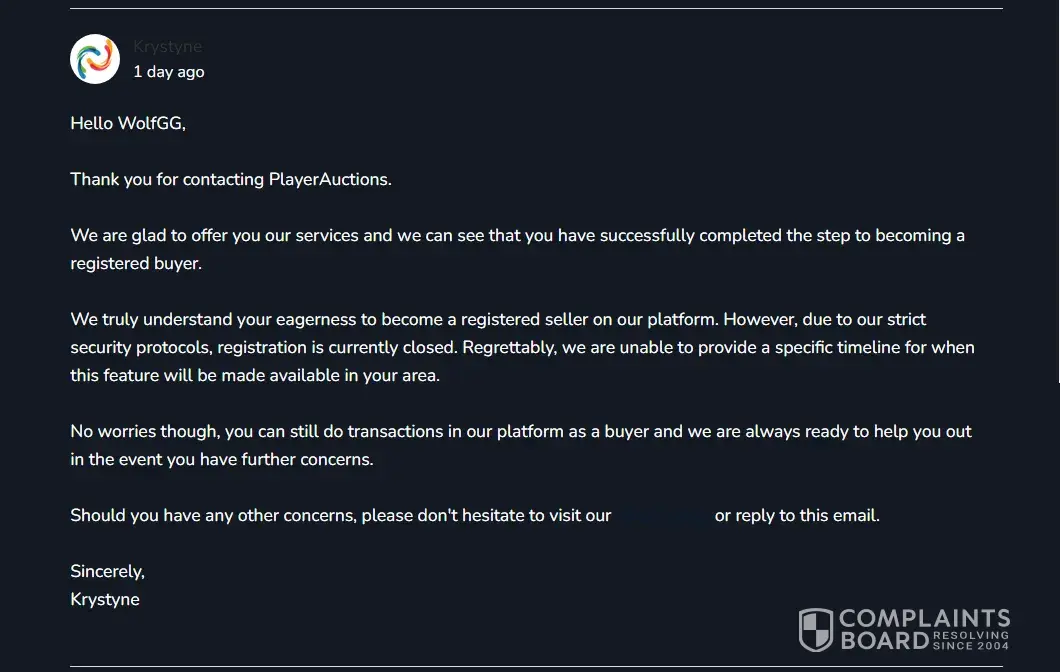 I would like to express my concern regarding playerauctions’ seller registration policy. It appears that users from egypt are being restricted from becoming sellers on the platform, while users from other countries can freely register and sell. This raises concerns about fairness and equal treatment, as it feels like playerauctions is discriminating...