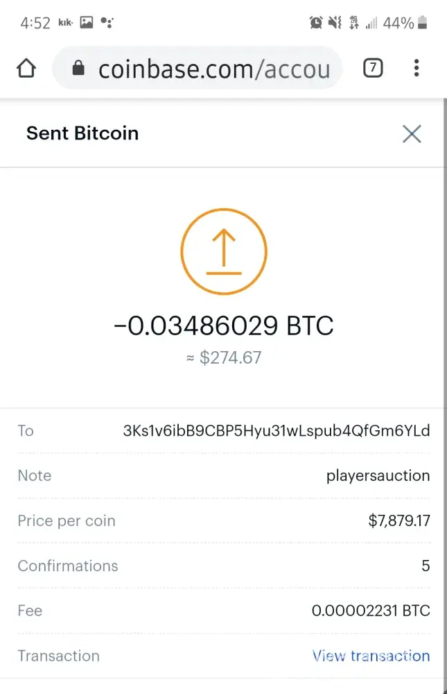 bitcoin sent but playerauctions claiming payment has not been received. $1,000!
