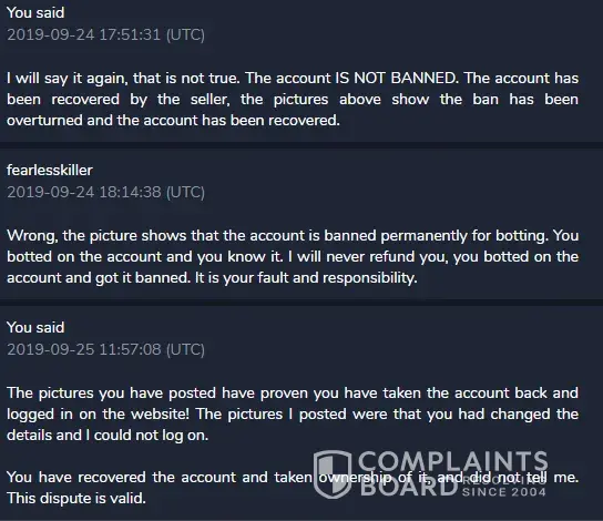 The 5th and 6th pictures are a seller denying ever recovering the account, and then after I had provided evidence they admitted it. I advised in my appeal that I could not trust the account seller after he recovered the account, that I wanted a refund and to return the account.