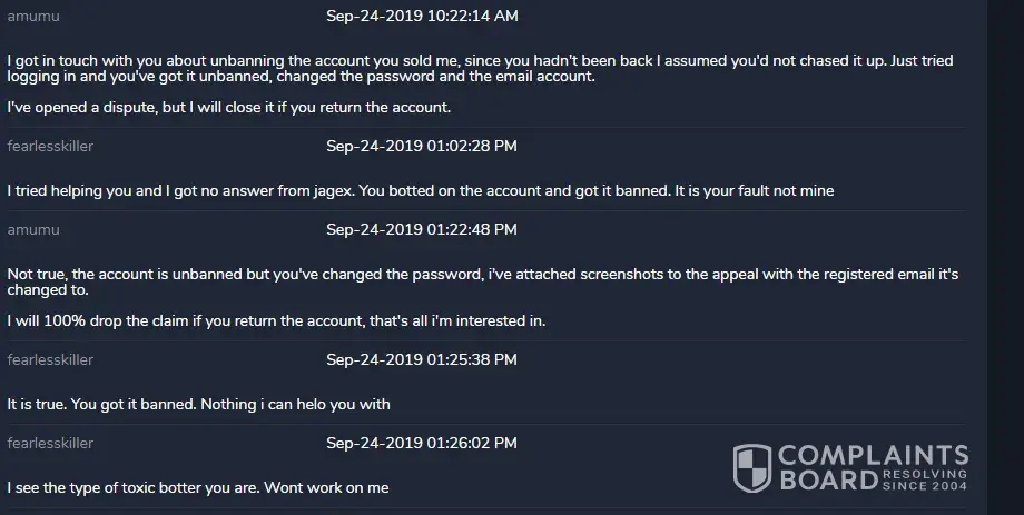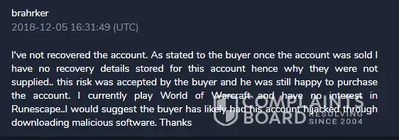 And again in 3918996 you are incorrect. The account was ABLE to be returned to me, however the account seller recovered the account and removed the bank value I had accumulated on it of around 300m gp which equates to around £170.