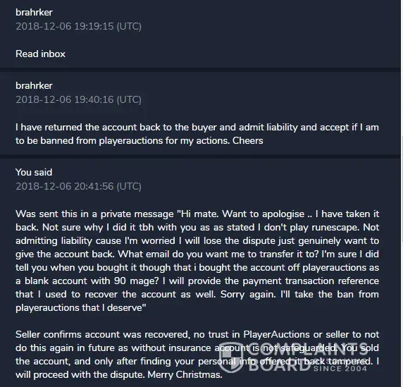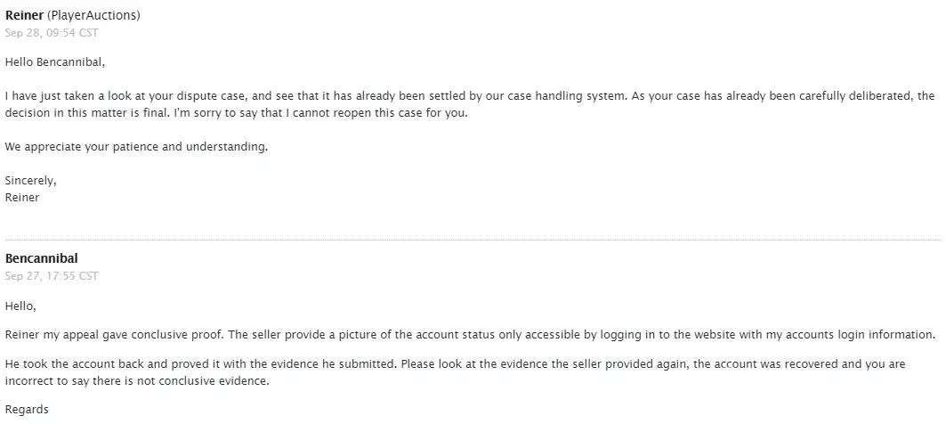 In both instances (The first where the seller admitted recovering it and the second where the seller showed screenshots of being logged on where I could not) PlayerAuctions closed both in favour of the seller with zero thought process, claiming there was insufficient evidence.
